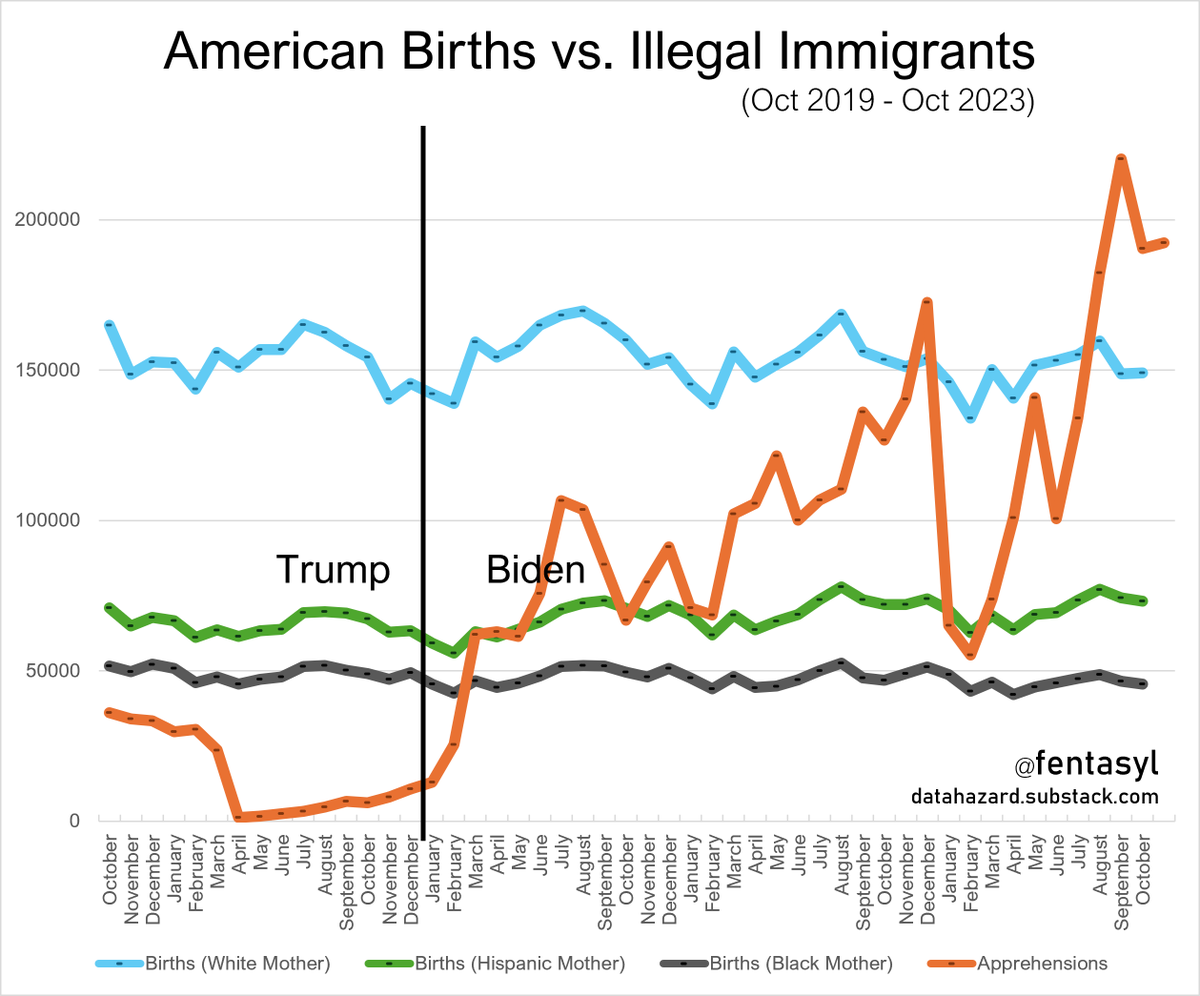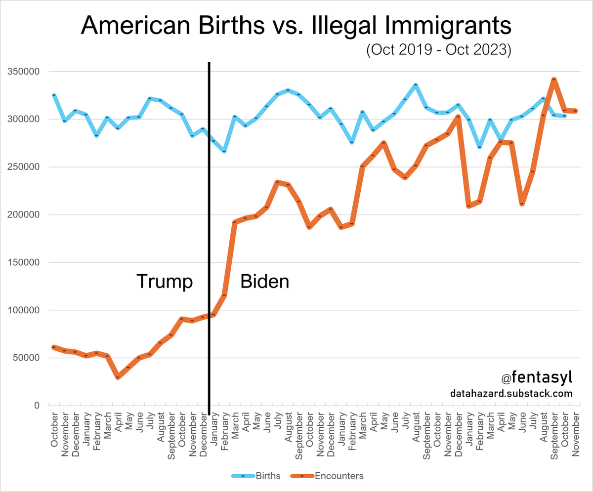 Here are the numbers when using only those classified as "Apprehensions" -- this, of course, significantly understates the actual number. These datasets are easily found on government websites. CBP: https://www.cbp.gov/document/stats/nationwide-encounters CDC: https://wonder.cdc.gov/natality.html