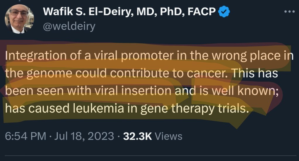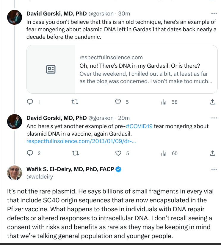 This is relevant as Dan pesters people like Wafik El-Diery (Director of the Cancer Center at Brown) to remain silent about the dsDNA in the vaccines. Wafik believes science shouldn't censor questions. Dan believes some questions are not allowed. https://x.com/weldeiry/status/1713573720466305280?s=20