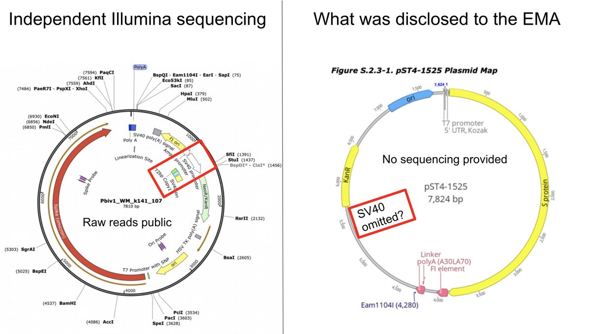 This SV40 sequence is superfluous. Moderna doesn't have it. Pfizer doesn't need it as it already has an AmpR promoter for the Kan gene. Pfizer hid it. Why?