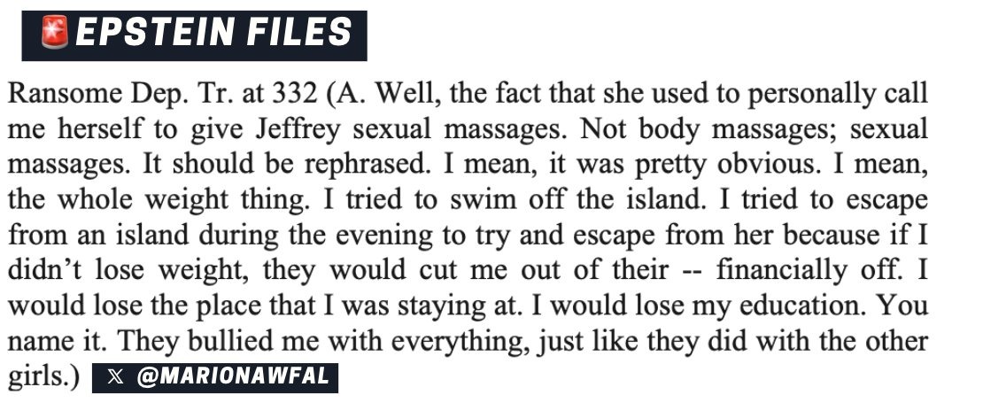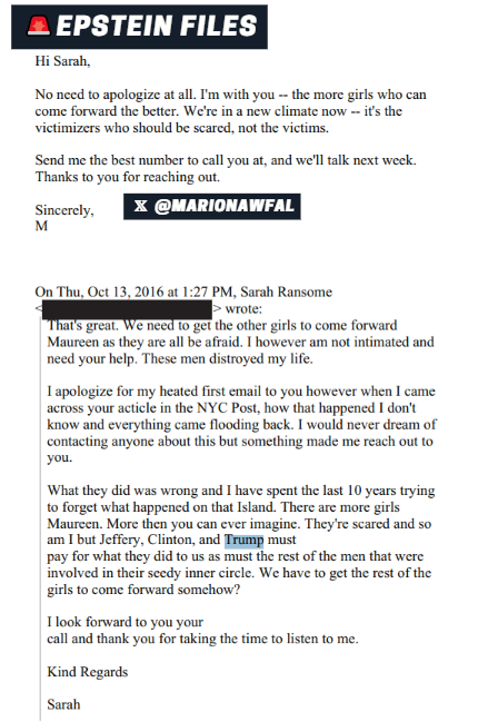 🚨 VICTIM SARAH SCARED OF EPSTEIN, CLINTON, AND TRUMP "What they did was wrong and I have spent the last 10 years trying to forget what happened on that Island. There are more girls Maureen. More then you can ever imagine. They're scared and so am I but Jeffery, Clinton, and Trump must pay for what they did to us as must the rest of the men that were involved in their seedy inner circle. We have to get the rest of the girls to come forward somehow?"