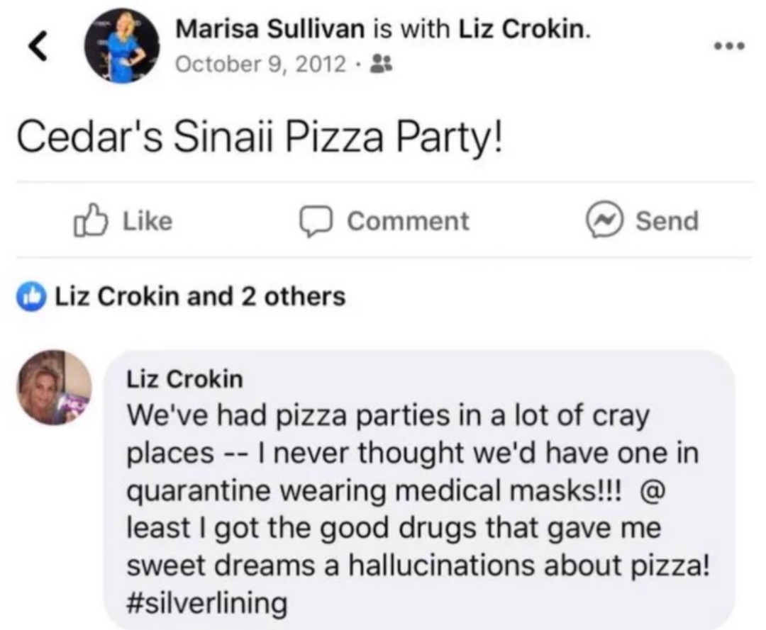 Marisa Sullivan. You know the one that threw that pizza party at Cedar Sinai. Your friend. Most people do not know this is a popular hospital for A-List celebrities. Stan Lee, Elizabeth Taylor, Frank Sinatra, Lucille Ball. All were patients there. It has a dirty secret.