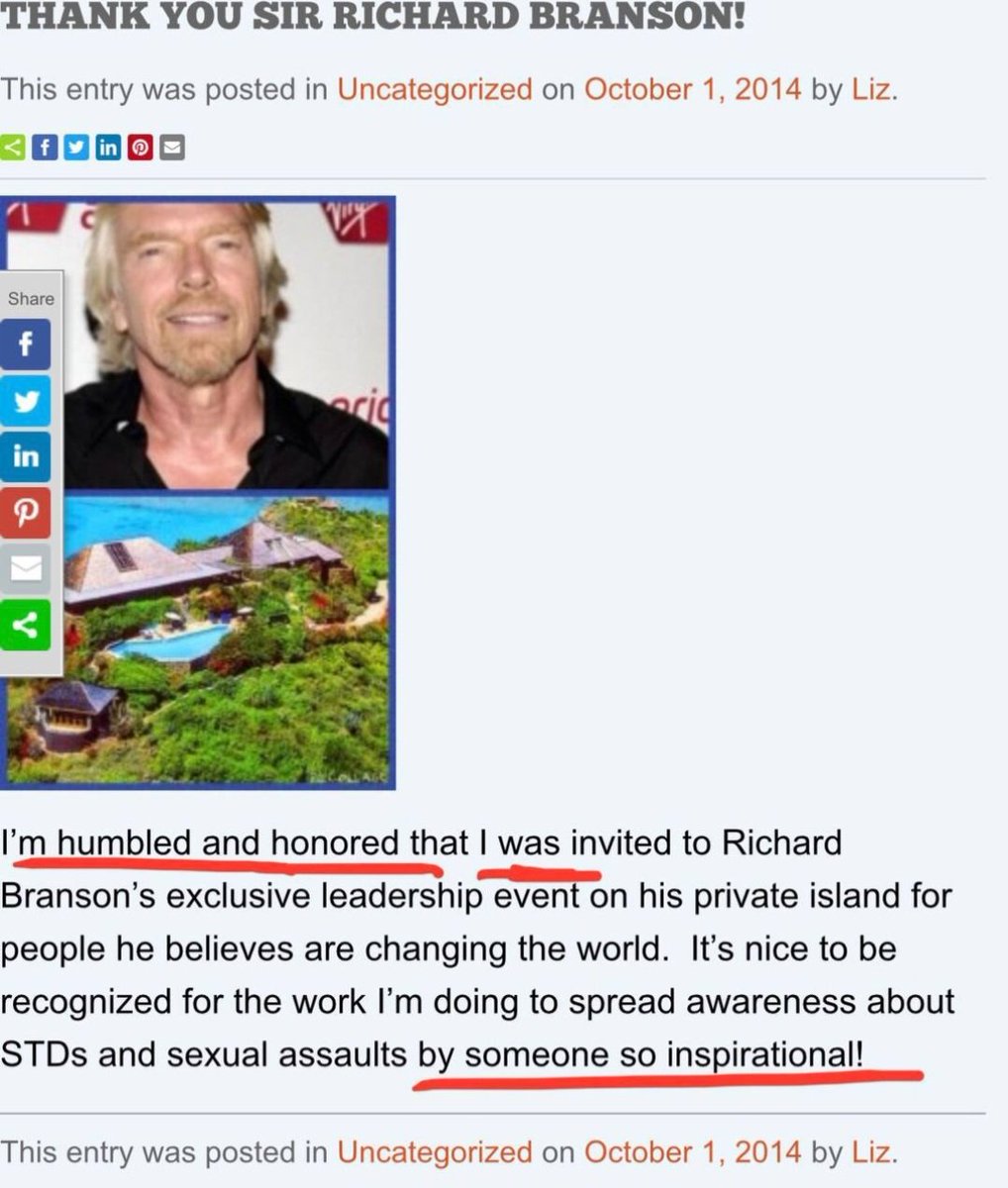 Liz, you were invited to Richard Branson's Island in 2014. He was best friends with Jeffrey Epstein. Remember you were honored to see him right? Why isn't your followers getting this info from you? You're a journalist right? I get it. Invites are more important than truth.