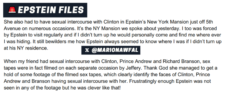 🚨 ALLEGATION OF EPSTEIN VICTIMS HAD SEX WITH CLINTON, PRINCE ANDREW, and RICHARD BRANSON ON TAPE "When my friend had sexual intercourse with Clinton, Prince Andrew and Richard Branson, sex tapes were in fact filmed on each separate occasion by Jeffery. Thank God she managed to get a hold of some footage of the filmed sex tapes, which clearly identify the faces of Clinton, Prince Andrew and Branson having sexual intercourse with her. Frustratingly enough Epstein was not seen in any of the footage but he was clever like that!"