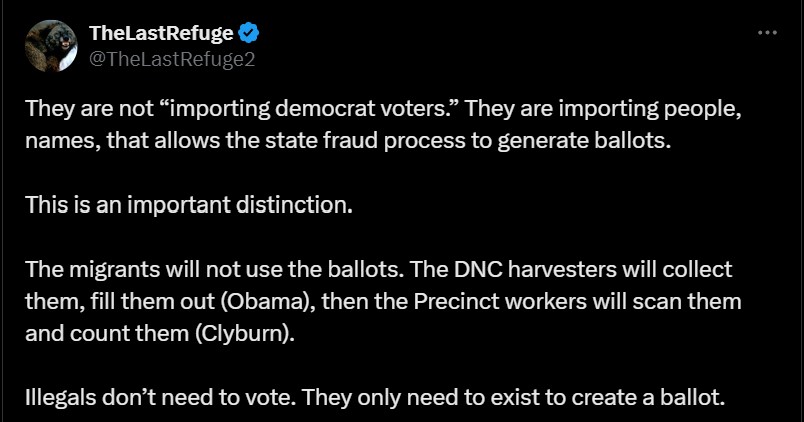 Great point. This is what people need to understand: Illegal aliens are not being imported to vote themselves. They are here to provide Democrat operatives with the opportunity to ballot harvest and to drop the ballots off at inner city drop boxes in swing states. You can tell by the way the Democrats universally: - Oppose voter IDs - Oppose cleaning voting rolls - Oppose single-day elections - Endorse mass mail-in ballots - Endorse electronic voting machines - Endorse unchecked illegal immigration The Socialists are conquering America — but it's not with bullets, but with ballots.