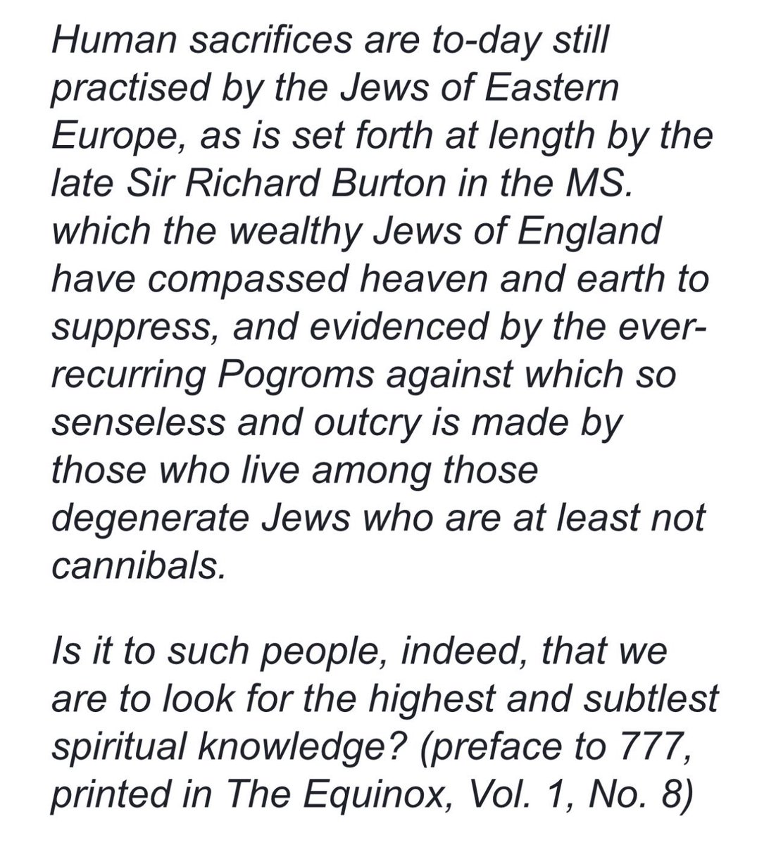 An excerpt from one of Crowley’s writing on Jewish pogroms and ritual sacrifice. “Human sacrifices are to-day still practiced by the Jews of Eastern Europe…” https://t.co/xcpyEkaMxO
