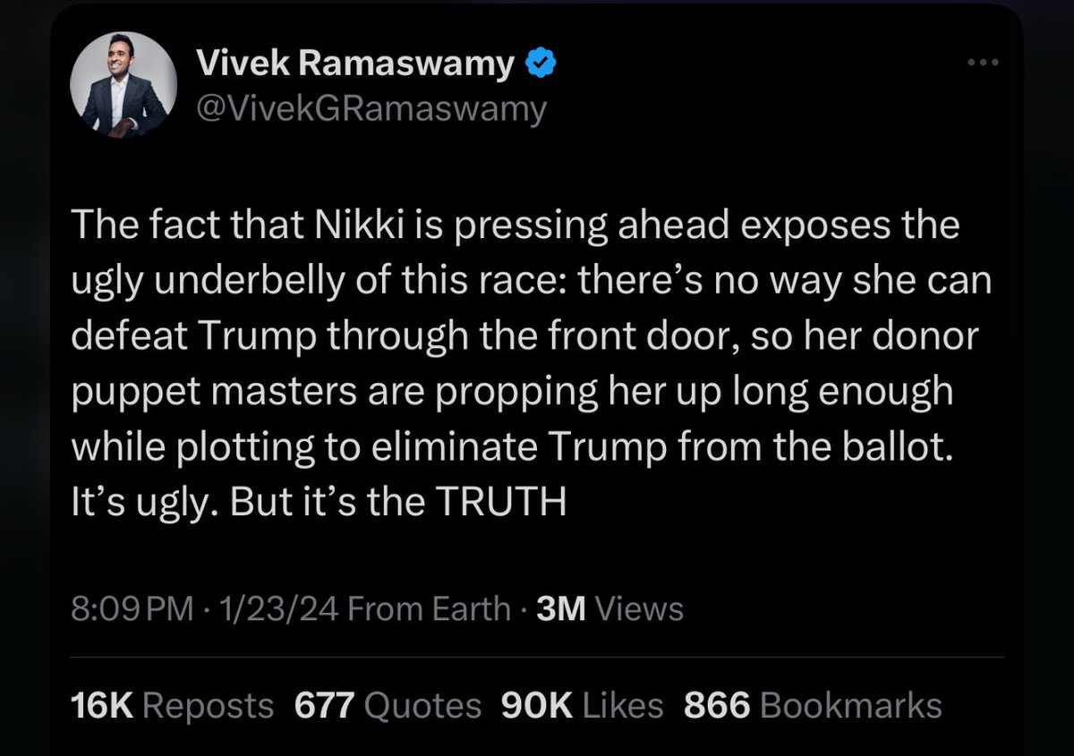 JUST IN: Vivek Ramaswamy shreds the Biden administration then turns on Nikki Haley and calls her a bigger fascist than Joe Biden. 🔥🔥🔥 “We're marching towards fascism. Under Biden, Jack Smith has subpoenaed every last retweet that someone has issued from Donald Trump in the year 2020.” “The only person more fascist than the Biden regime now is Nikki Haley, who thinks the government should identify every one of those individuals with an ID. That is not freedom, that is fascism. And she should come nowhere near the levers of power, let alone the White House.”