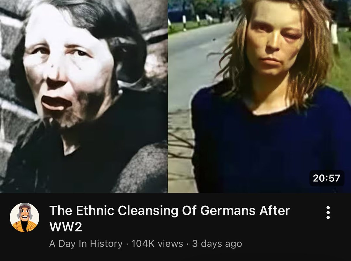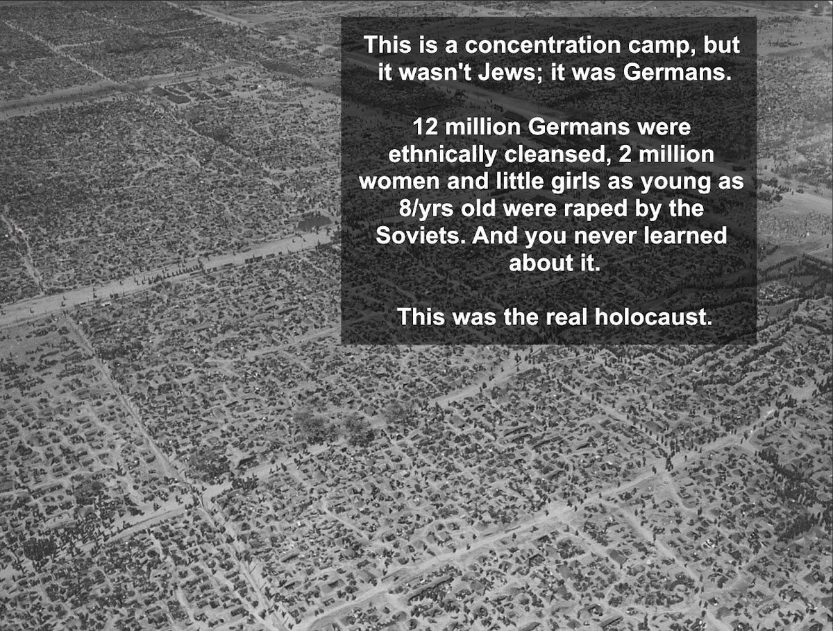 Americans know nothing about real history. Did you know that 12 million Germans were ethnically cleansed after WW2? Did you know half a million of them were murdered for the crime of speaking German? That Children were lined up and shot? “Well over 2 million women and children were raped at the end of the war. Many of them died or killed themself as a result.” In Czechoslovakia, they lined German civilians up (many of whom had lived there for centuries), and ran over their legs with trucks. They forced them to dig their own graves. Not all of them were German. Some of them just spoke German. 12 million German civilians were expelled across Eastern Europe—force stripped of their homes and property and citizenry for the crime of speaking German. Hundreds of thousands of them starved to death. This ethnic expulsion was the largest in human history and yet you’ve never heard about it. Why? I encourage everyone to watch this documentary. https://dailymotion.com/video/x7uflp0