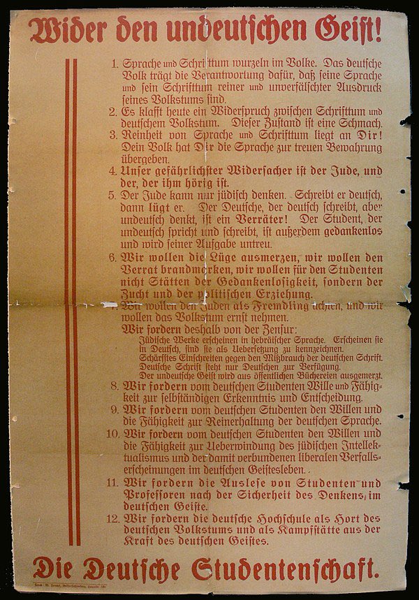 Against the un-German spirit! 1. Language and literature have their roots in the Folk. It is the German Folk's responsibility to assure that its language and literature are the pure and unadulterated expression of its Folk traditions. 2. At present there is a chasm between literature and German tradition. This situation is a disgrace. 3. Purity of language and literature is your responsibility! Your Folk has entrusted you with the duty of faithfully preserving your language. 4. Our most dangerous enemy is the Jew and those who are his slaves. 5. A Jew can only think Jewish. If he writes in German, he is lying. The German who writes in German, but thinks un-German, is a traitor! The student who speaks and writes un-German is, in addition, thoughtless and has abandoned his duties. 6. We want to eradicate lies, we want to denounce treason, we want institutions of discipline and political education for us the students, not mindlessness. 7. We want to regard the Jew as alien and we want to respect the traditions of the Folk. Therefore, we demand of the censor: Jewish writings are to be published in Hebrew. If they appear in German, they must be identified as translations. Strongest actions against the abuse of the German script. German script is only available to Germans. The un-German spirit is to be eradicated from public libraries. 8. We demand of the German students the desire and capability for independent knowledge and decisions. 9. We demand of German students the desire and capability to maintain the purity of the German language. 10. We demand of German students the desire and capability to overcome Jewish intellectualism and the resulting liberal decay in the German spirit. 11. We demand the selection of students and professors in accordance with their reliability and commitment to the German spirit. 12. We demand that German universities be a stronghold of the German Folk tradition and a battleground reflecting the power of the German mind. The German Student Association.