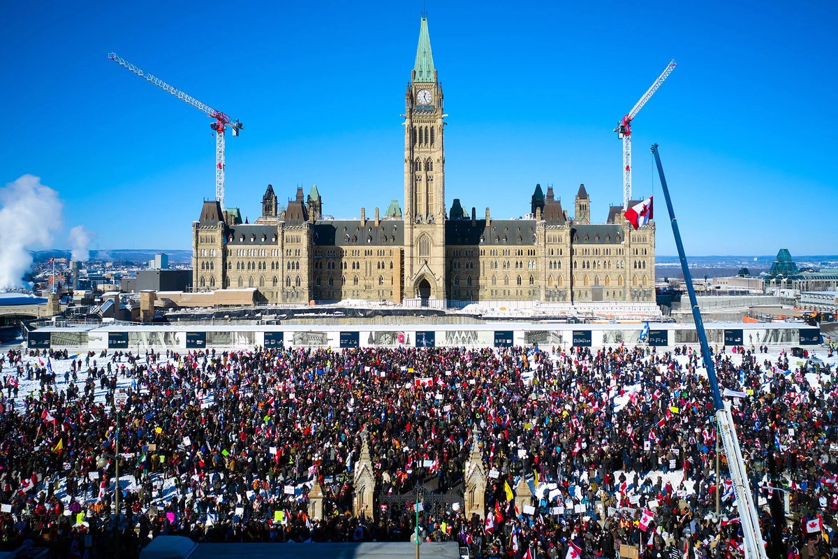February 14, 2022 Trudeau invokes the Emergencies Act "to end border blockades* and the occupation of downtown Ottawa" by protesters. *(all blockades had been cleared 𝘣𝘦𝘧𝘰𝘳𝘦 the EA) The Act gives banks temporary powers to freeze accounts.