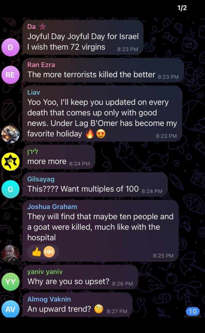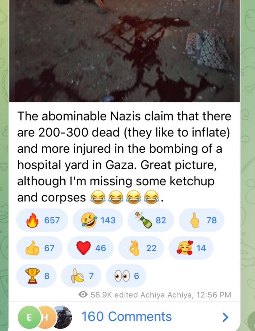 🇮🇱🇵🇸 A popular Israeli Telegram channel with 85,000 subscribers is celebrating Israel’s bombing of the Gaza Baptist hospital! They posted a photo of one of the 500+ dead civilians, writing “Great picture, although I'm missing some ketchup and corpses.” https://t.co/J3Zf0RbAos