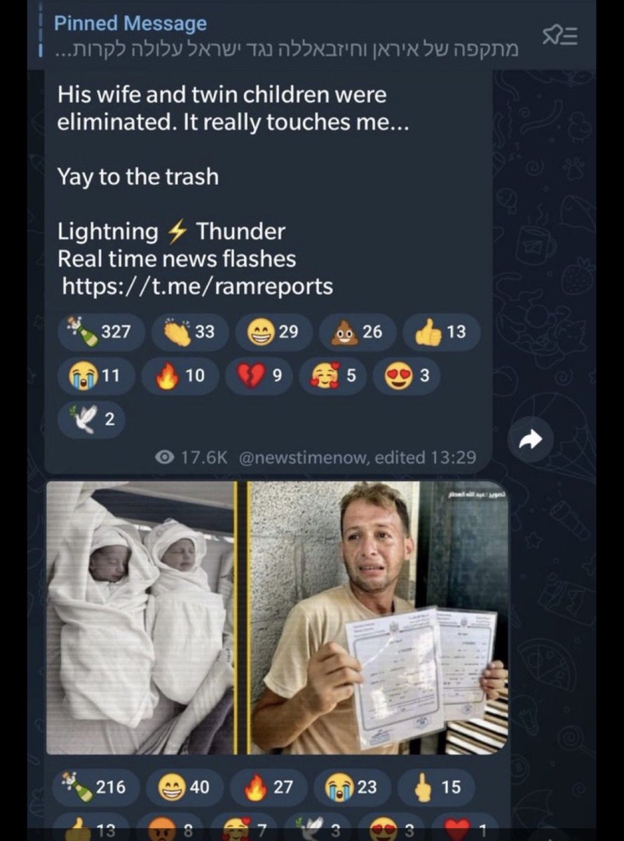 This man’s twin sons were killed by the IDF while he was at the hospital registering their births People on Israeli telegram channels finds this hilarious This is our greatest ally https://t.co/jYgMORxWk3