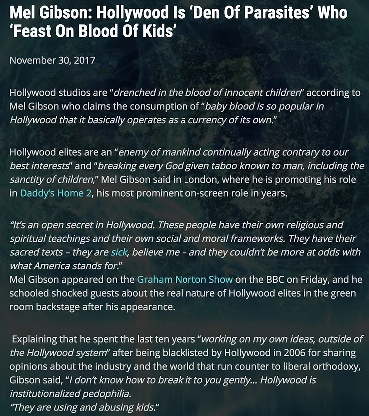 Mel Gibson exposing $34b industry child trafficking in 4 part documentary, including Ukraine! Look out for the anti Gibson stories if not worse!!! https://wegotthiscovered.com/celebrities/controversy-magnet-mel-gibson-allegedly-exposing-34-billion-trafficking-operation-in-4-part-documentary/