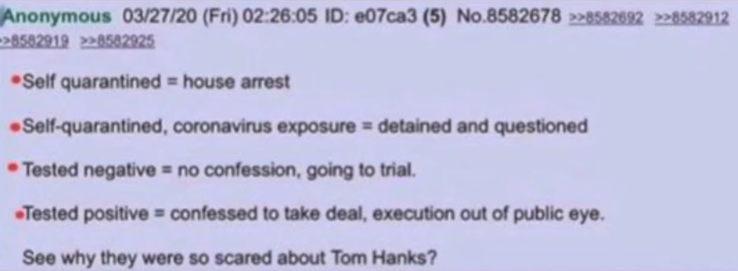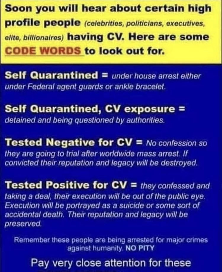 Have You Noticed Many Elites “Testing” For COVID: Self Quarantined = House Arrest Self Quarantined + COVID Exposure = Detained & Questioned COVID- = No Confession, Public Trial & Execution COVID+ = Confession Given, Deal Accepted & Rommel Death 💊 https://www.humorousmathematics.com/post/mid-2020-gitmo-update-arrests-indictments-executions