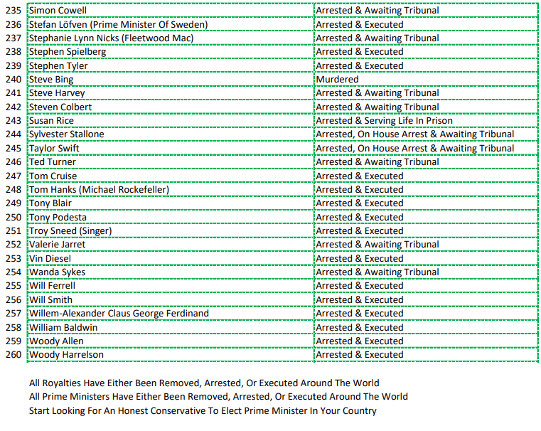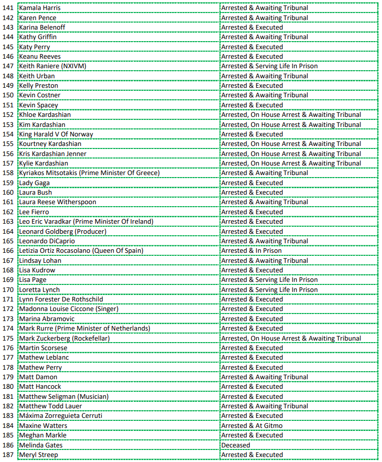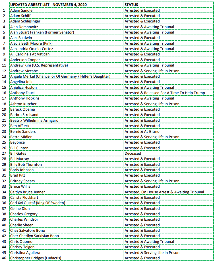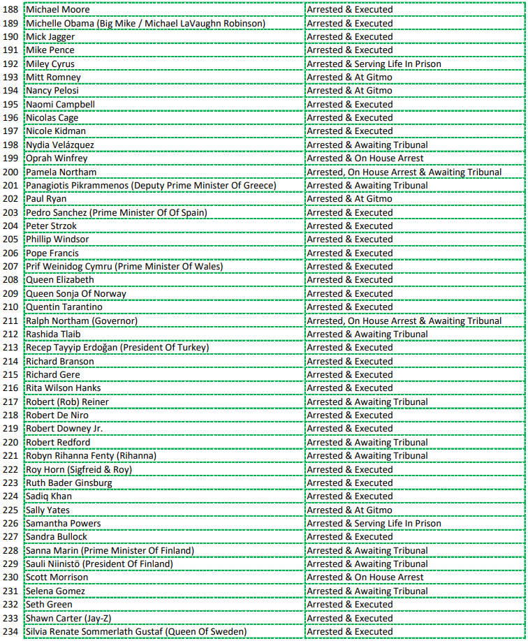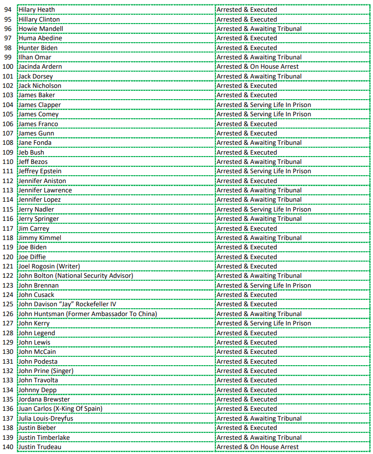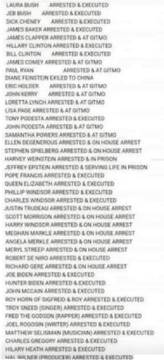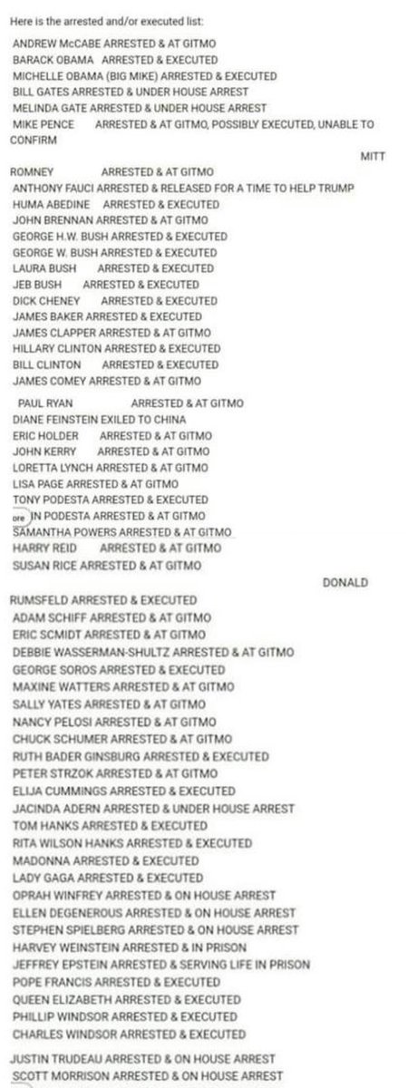 As of June 11, 2020 lists with elites' names began circulating on social media. Identifying who is/was awaiting tribunal, executed, GITMO'd, imprisoned, or on house arrest. There are many versions of the lists and appears to be overlap in names. 💊 https://www.humorousmathematics.com/post/mid-2020-gitmo-update-arrests-indictments-executions