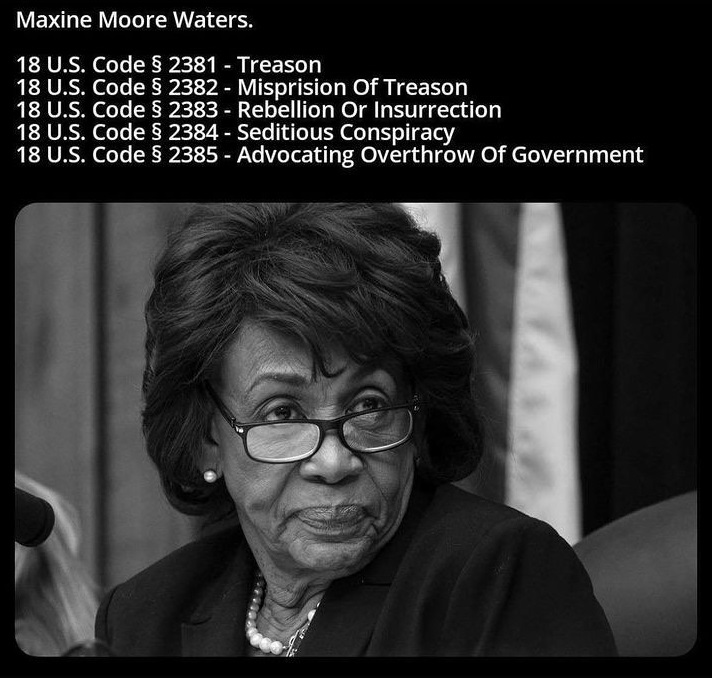 ⛓ @MaxineWaters/@RepMaxineWaters Arrested. ☠️ Executed. Code § 2381-2385. Crimes Against Humanity. 🔁 Replaced. Military Installed Crisis Actor Doubles. 💊 https://humorousmathematics.com/post/mid-2020-gitmo-update-arrests-indictments-executions 💊 https://humorousmathematics.com/post/the-executed-clones-doubles-vril-lizard-reptilian-parasites