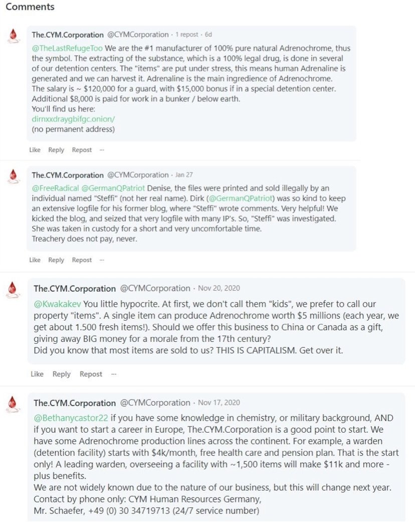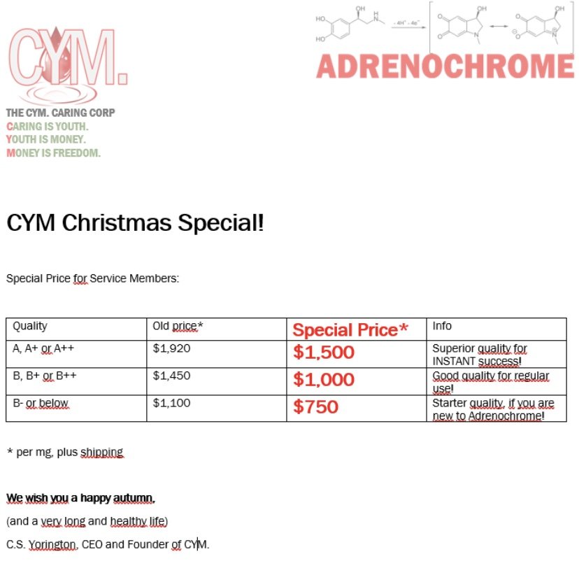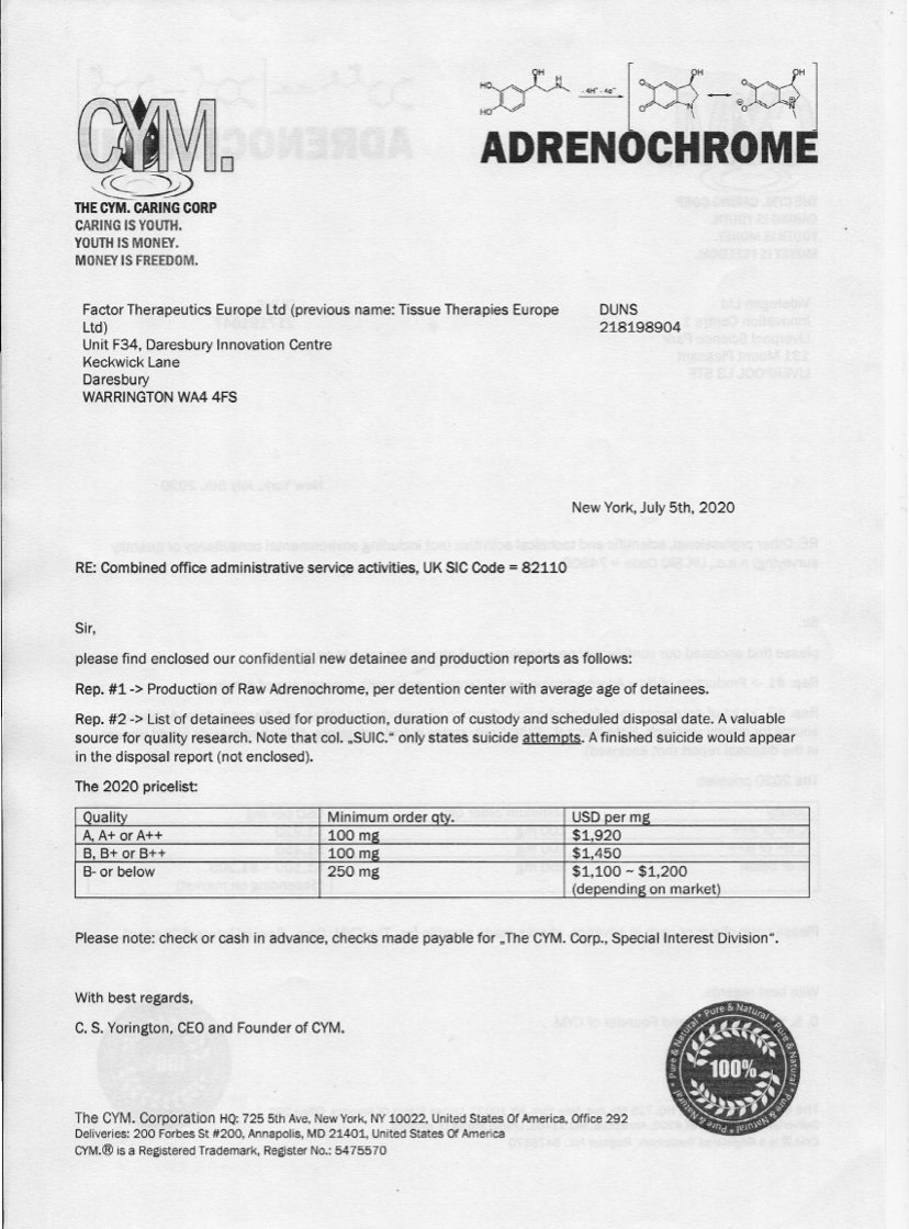CYM Caring Corp internal documents surfaced online on multiple occasions, including pricing. CYM boasts about having the purest natural adrenochrome and refers to their purchased and enslaved children in their "detention centers" as "items." 💊 https://humorousmathematics.com/post/what-is-adrenochrome-follow-the-white-rabbit