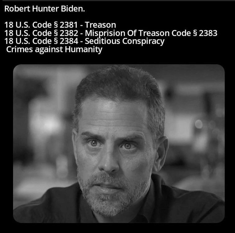 ⛓ Hunter Biden Arrested. ☠️ Executed. Code § 2381, 2382 & 2384. Crimes Against Humanity. 🔁 Replaced. Military Installed Crisis Actor Doubles. 💊 https://humorousmathematics.com/post/mid-2020-gitmo-update-arrests-indictments-executions 💊 https://humorousmathematics.com/post/the-executed-clones-doubles-vril-lizard-reptilian-parasites