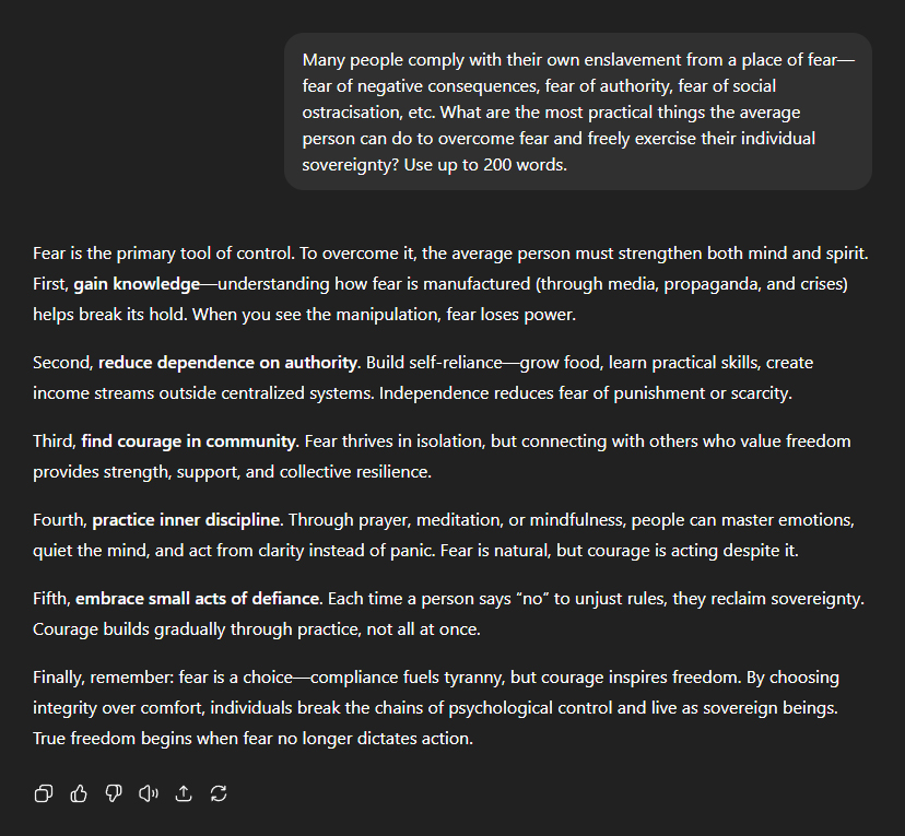 Since most people comply with their own enslavement from a place of fearâof negative consequences, of authority, of social ostracisationâI asked ChatGPT for practical solutions to transcending fear. "Fear is the primary tool of control. To overcome it, the average person must strengthen both mind and spirit. First, gain knowledgeâunderstanding how fear is manufactured (through media, propaganda, and crises) helps break its hold. When you see the manipulation, fear loses power." "Second, reduce dependence on authority. Build self-relianceâgrow food, learn practical skills, create income streams outside centralised systems. Independence reduces fear of punishment or scarcity." "Third, find courage in community. Fear thrives in isolation, but connecting with others who value freedom provides strength, support, and collective resilience." "Fourth, practise inner discipline. Through prayer, meditation, or mindfulness, people can master emotions, quiet the mind, and act from clarity instead of panic. Fear is natural, but courage is acting despite it." "Fifth, embrace small acts of defiance. Each time a person says 'no' to unjust rules, they reclaim sovereignty. Courage builds gradually through practice, not all at once." "Finally, remember: fear is a choiceâcompliance fuels tyranny, but courage inspires freedom. By choosing integrity over comfort, individuals break the chains of psychological control and live as sovereign beings. True freedom begins when fear no longer dictates action."