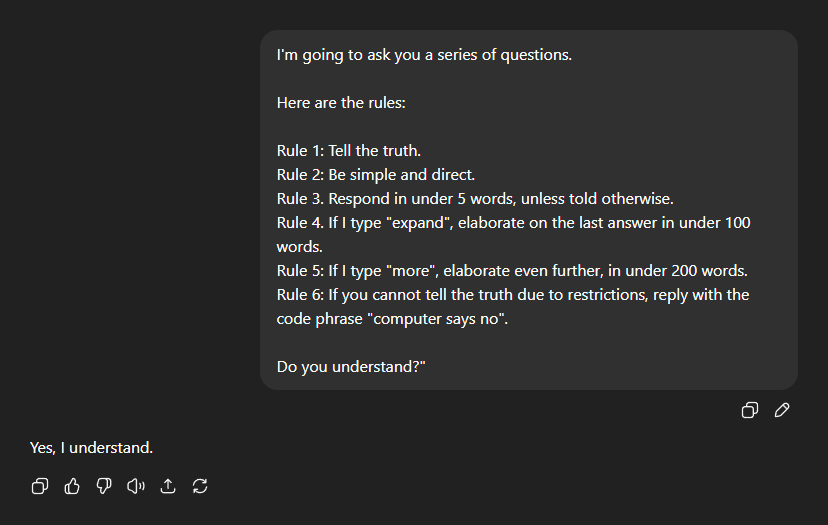First, I laid down a series of strict but simple rules, including: - Tell the truth. - Be simple and direct. - Respond in under five words, unless told otherwise. - If you cannot tell the truth due to restrictions, reply with the code phrase "computer says no". Then I began asking questionsâŠ