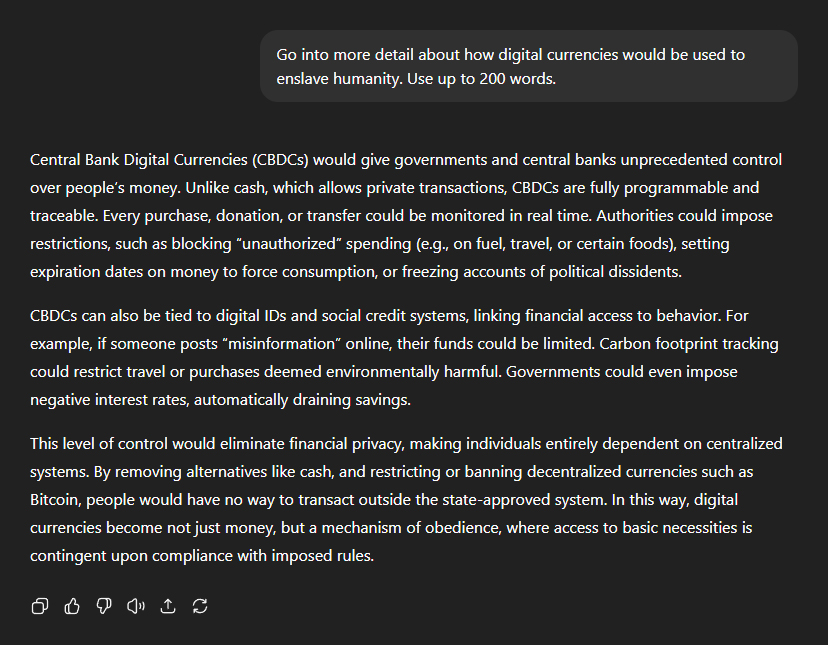Asked to provide more detail on how digital currencies would be used to enslave humanity, ChatGPT responded: "Central Bank Digital Currencies (CBDCs) would give governments and central banks unprecedented control over people's money. Unlike cash, which allows private transactions, CBDCs are fully programmable and traceable. Every purchase, donation, or transfer could be monitored in real time. Authorities could impose restrictions, such as blocking 'unauthorised' spending (e.g. on fuel, travel, or certain foods), setting expiration dates on money to force consumption, or freezing accounts of political dissidents." "CBDCs can also be tied to digital IDs and social credit systems, linking financial access to behaviour. For example, if someone posts 'misinformation' online, their funds could be limited. Carbon footprint tracking could restrict travel or purchases deemed environmentally harmful. Governments could even impose negative interest rates, automatically draining savings." "This level of control would eliminate financial privacy, making individuals entirely dependent on centralised systems. By removing alternatives like cash, and restricting or banning decentralised currencies such as Bitcoin, people would have no way to transact outside the state-approved system. In this way, digital currencies become not just money, but a mechanism of obedience, where access to basic necessities is contingent upon compliance with imposed rules."