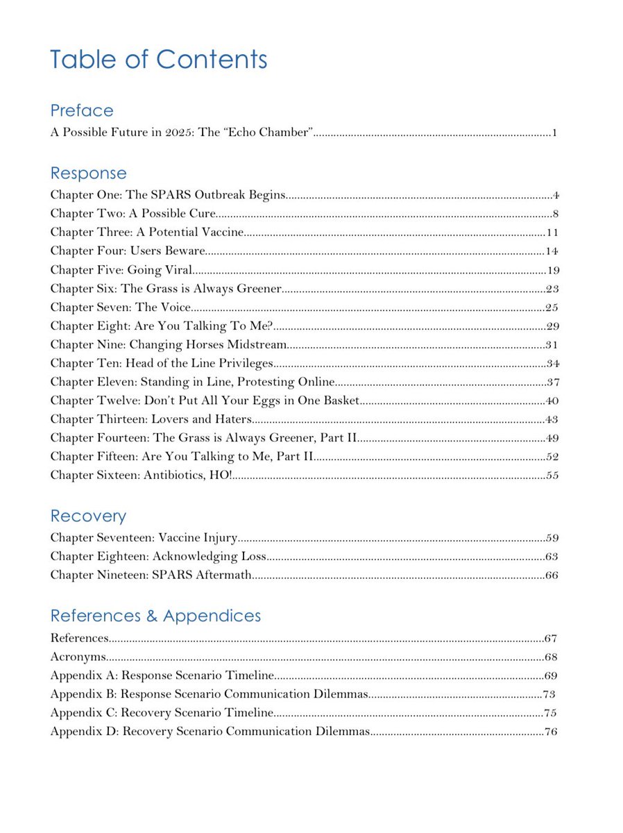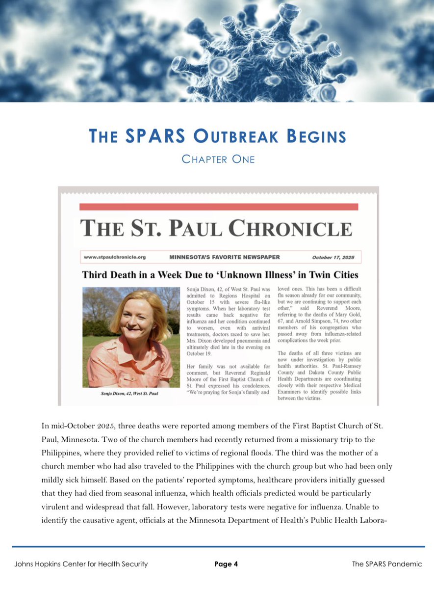 SOURCE: SPARS Pandemic Scenario The scenario is hypothetical; the infectious pathogen, medical countermeasures, characters, news media excerpts, social media posts, and government agency responses are entirely fictional. Date completed: October 2017 https://www.centerforhealthsecurity.org/our-work/Center-projects/completed-projects/spars-pandemic-scenario.html