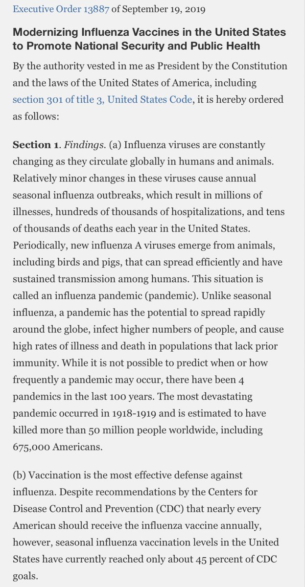 (13/19) 24 Sep 2019: 3 months before Covid, Trumpâs Executive Order 13887 pushes for expanding rapid vaccine production.