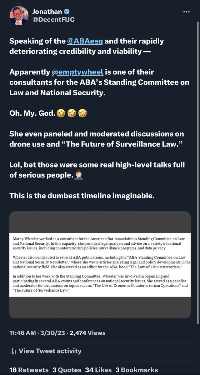 💥Btw, here’s a fun reminder — @emptywheel actually serves on advisory committees regarding law, national security and surveillance for the @ABAesq too, nbd. (RIP to the ABA.) 🤣🤣🤣🤣🤣