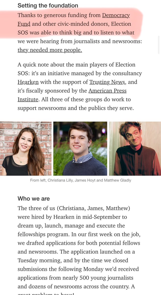 Just to keep things clear, here’s the info on ElectionSos funding and ownership. ♦️Hearken is a founding member of ElectionSOS “Election SOS is created by Hearken with the support of Trusting News and is fiscally sponsored by the American Press Institute with lead funding from The Democracy Fund.” https://archive.is/xDwCH ♦️ElectionSOS says it is funded by Democracy Fund “Thanks to generous funding from Democracy Fund and other civic-minded donors, Election SOS was able to think big” https://archive.is/I1vk2 ♦️Omidyar Democracy Fund is Soros Democracy Alliance. And checks for them get mailed to Arabella Sixteen Thirty and New Venture Funds. This is actually a tad confusing. Because Omidyar runs it but Soros Democracy Alliance created it? Am I understanding this right? “The DA established the 2020 State Funds, an aligned set of collaborative funds that are making significant investments in 12 strategic states in Spring 2015. The funds include: 🔹Democracy Fund 🔹Etc https://www.influencewatch.org/app/uploads/2019/04/Democracy-Alliance-2020-Investment-Portfolio-Report.pdf ♦️Soros is a founding partner of DA (Democracy Alliance) politico.com/f/?id=00000158…