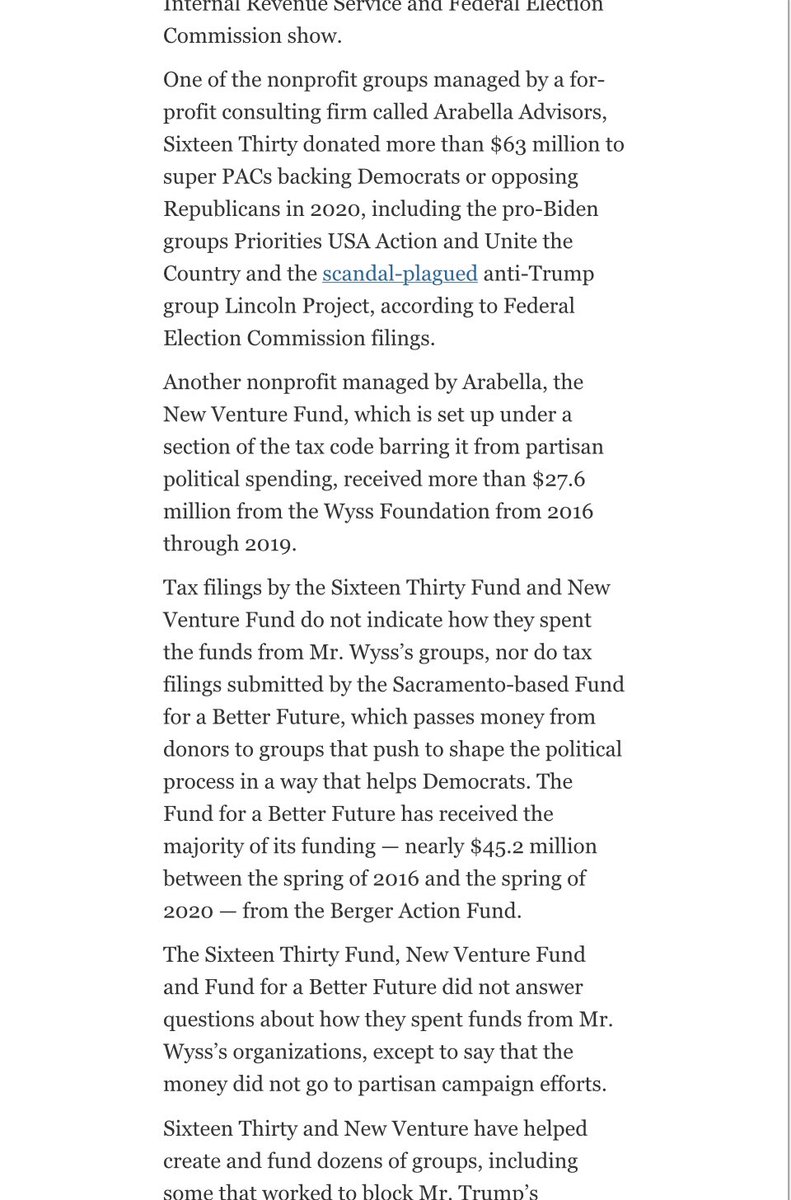 Breaking! Lincoln Project is funded by Arabella Sixteen Thirty Fund. The same fund that collects donations from tons of Soros Democracy Alliance partners. They are just another Demoncrat grift. New York Times https://archive.is/eeuSi