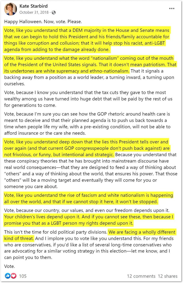 11/ In October 2018, Starbird told her Facebook followers to vote Democrat to hold Trump responsible for "corruption and collusion" and his "racist, anti-LGBT agenda." Starbird claimed Trump's “nationalism” didn’t stand for “patriotism” but instead stood for “white supremacy." She implored her Facebook followers to vote Democrat to stop "the rise of fascism and white nationalism." "Your children's lives depend upon it," she explained. "We are facing a wholly different kind of threat." This was one of the people in charge of censoring the 2020 election.