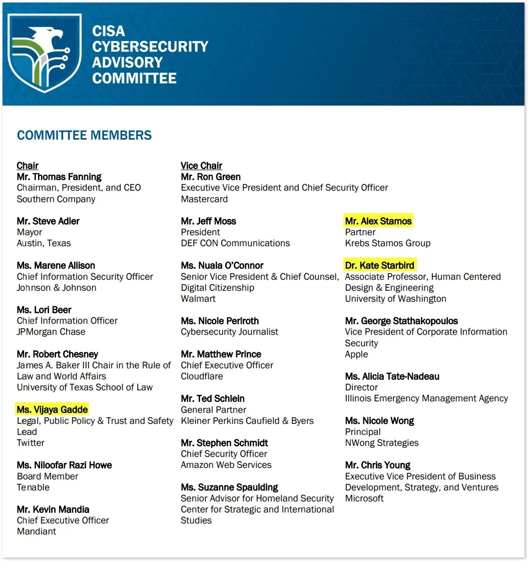 12/ Kate Starbird heads CISA's disinformation advisory panel with Vijaya Gadde, the former top lawyer at Twitter, who famously banned the former President and opposed @elonmusk proposal to roll back Twitter censorship policies.