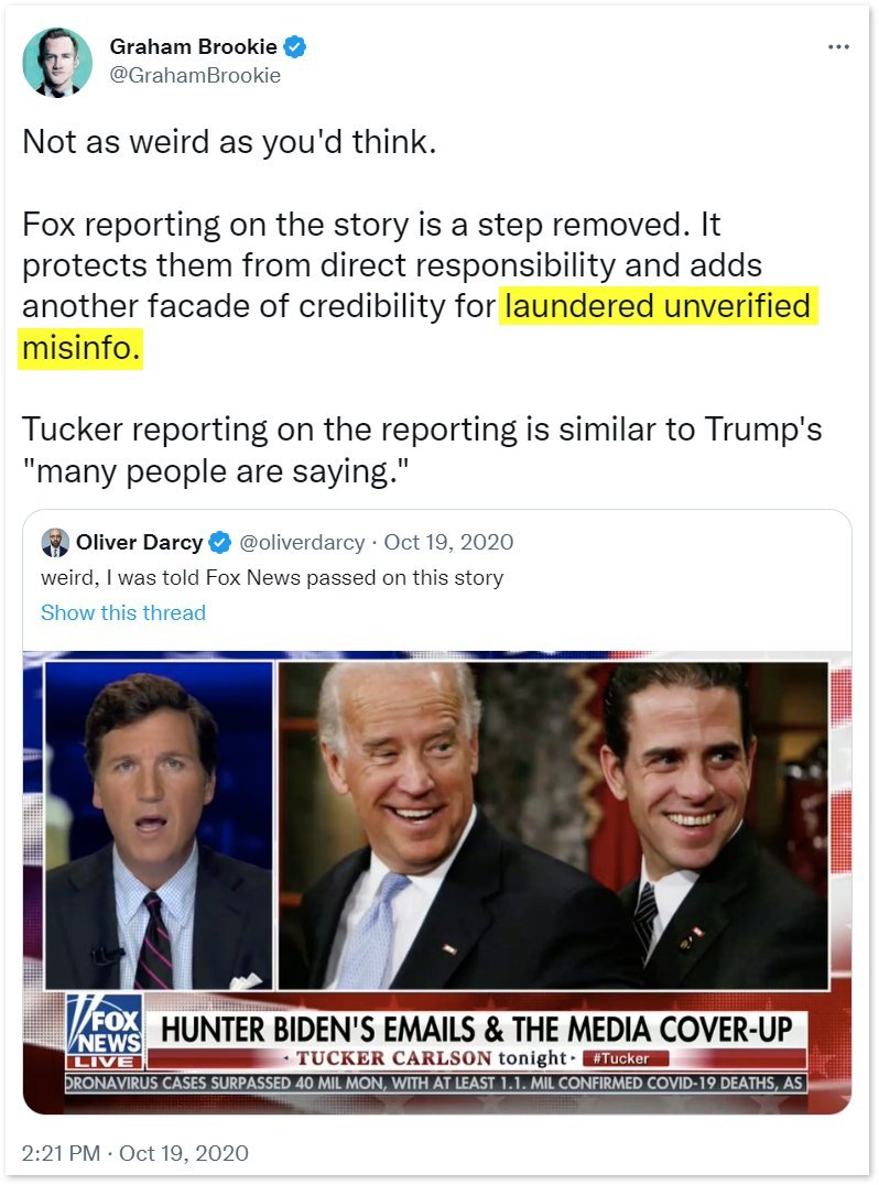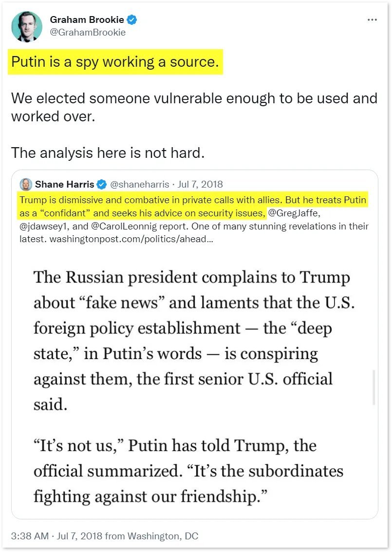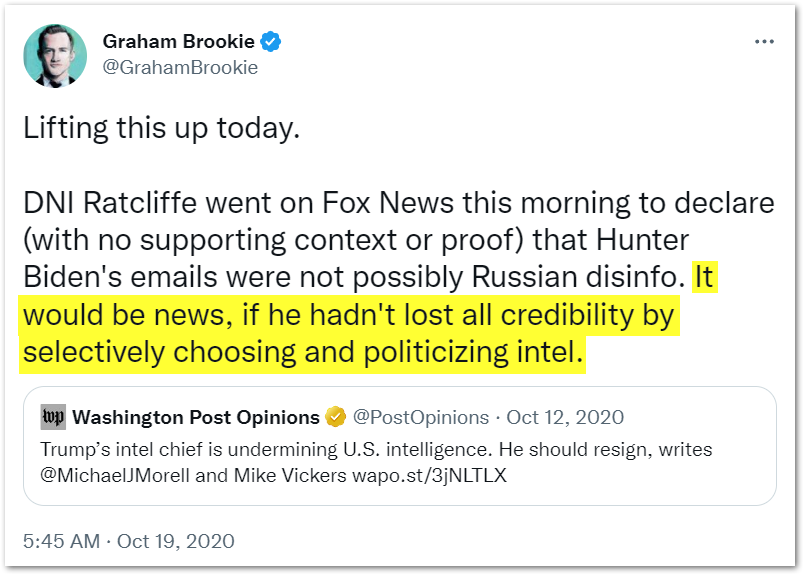13/ Graham Brookie is the figure who led the Atlantic Council’s Digital Forensic Research Lab and a previous Obama White House National Security Council member. The Atlantic Council is a NATO think-tank with seven living CIA directors as members. Brookie, a government-funded disinformation expert, dedicated much of his time during President Trump’s years in the White House to promoting the false narrative that the President of the United States was a Russian agent controlled by Vladimir Putin. In Oct. 2020, Brookie would call the #BidenLaptop “laundered unverified misinfo.” When DNI John Ratcliffe stated that the laptop was legitimate, Brookie publicly condemned Ratcliffe’s “credibility” and accused him of “politicizing intel.”