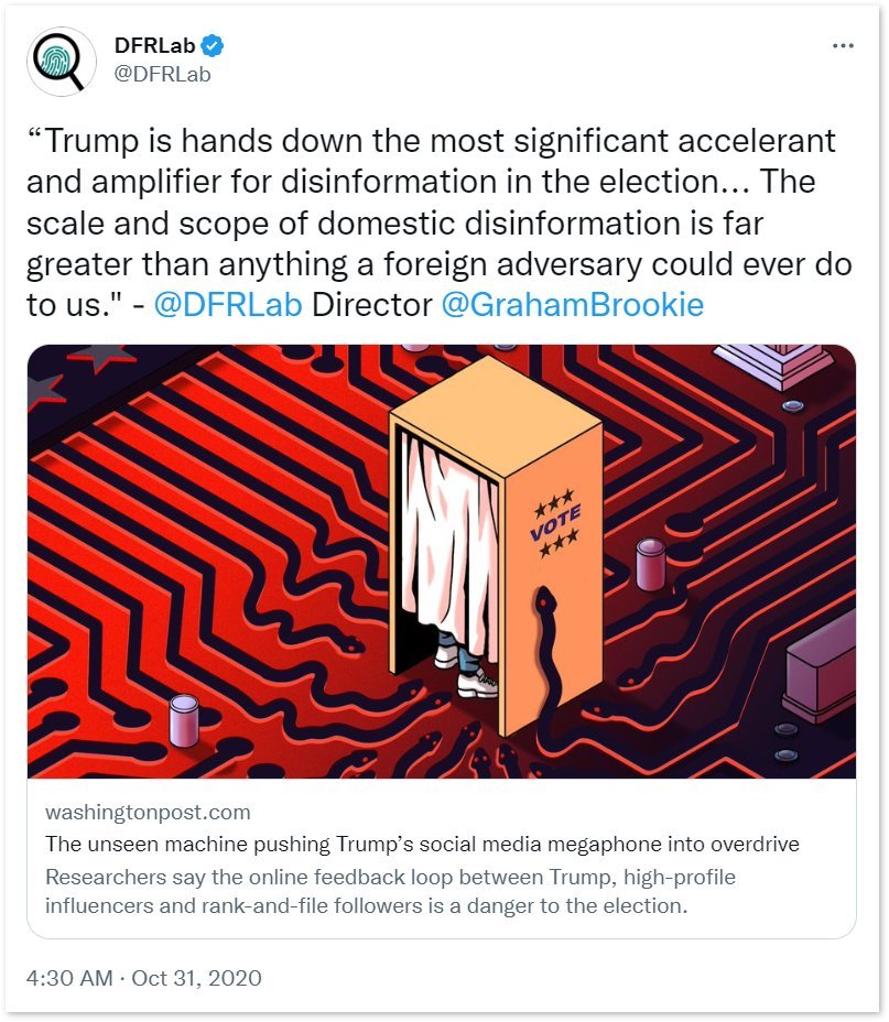 14/ Incredibly, the Atlantic Council's disinfo lab tasked by the DHS to censor the 2020 election tweeted its director's disdain for President Trump days before the election. "Trump is hands down the most significant accelerant and amplifier for disinformation in the election."