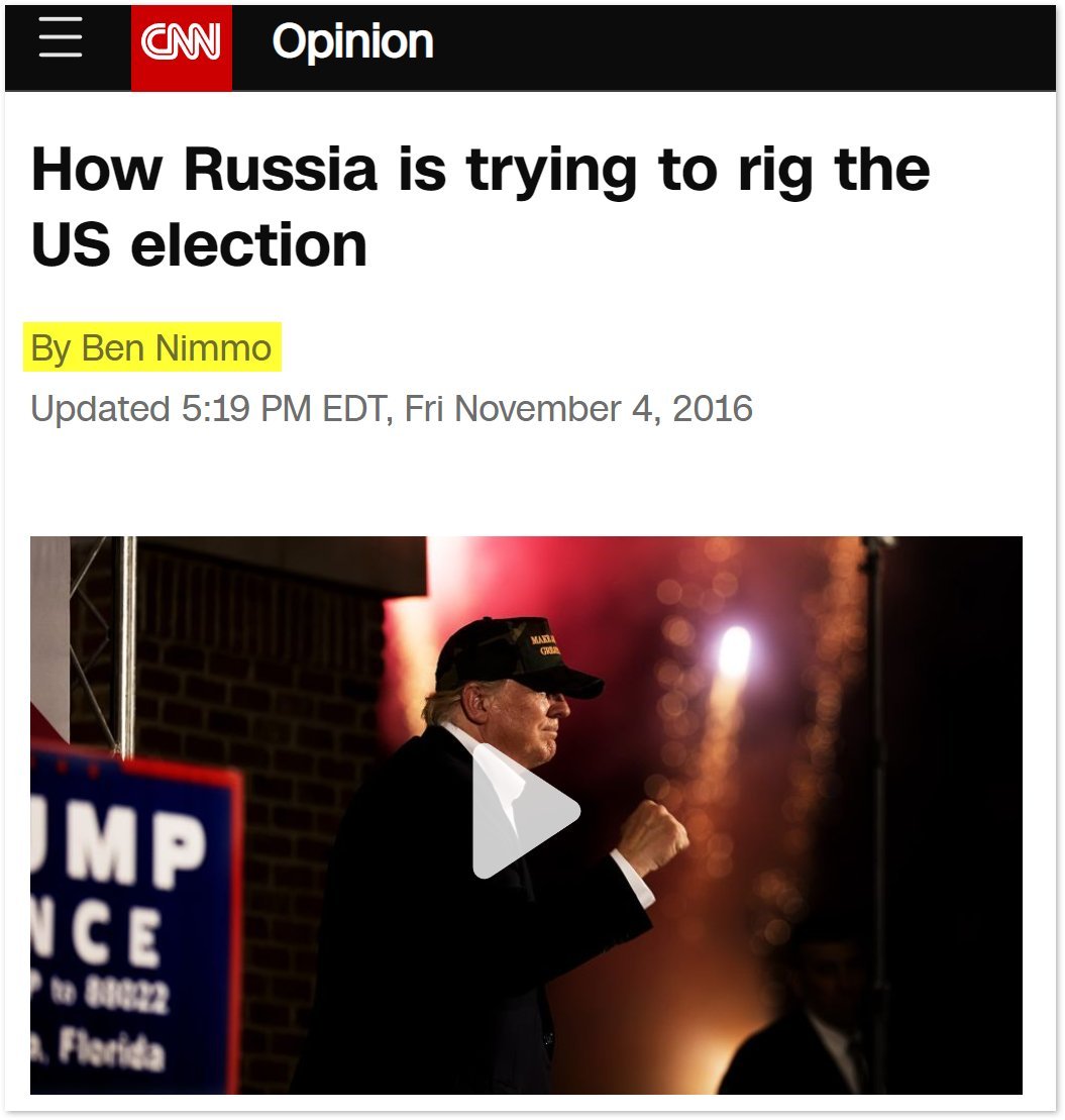 15/ Ben Nimmo, a Facebook exec, leads the censorship role at Graphika and is a Senior Fellow at the Atlantic Council’s DFR Lab. He was a NATO press officer and was briefly listed as a senior fellow at the UK Institute for Statecraft. “Donald Trump is right that someone is trying to rig the US election, but it is not Hillary Clinton: it is the Kremlin, and Trump is an accomplice, whether or not he realizes it,” Nimmo lamented in 2016. The Pentagon awarded Graphika $5 million in 2021 for more censorship of "disinformation."