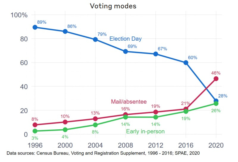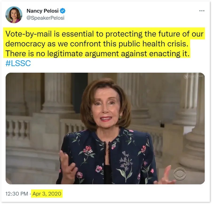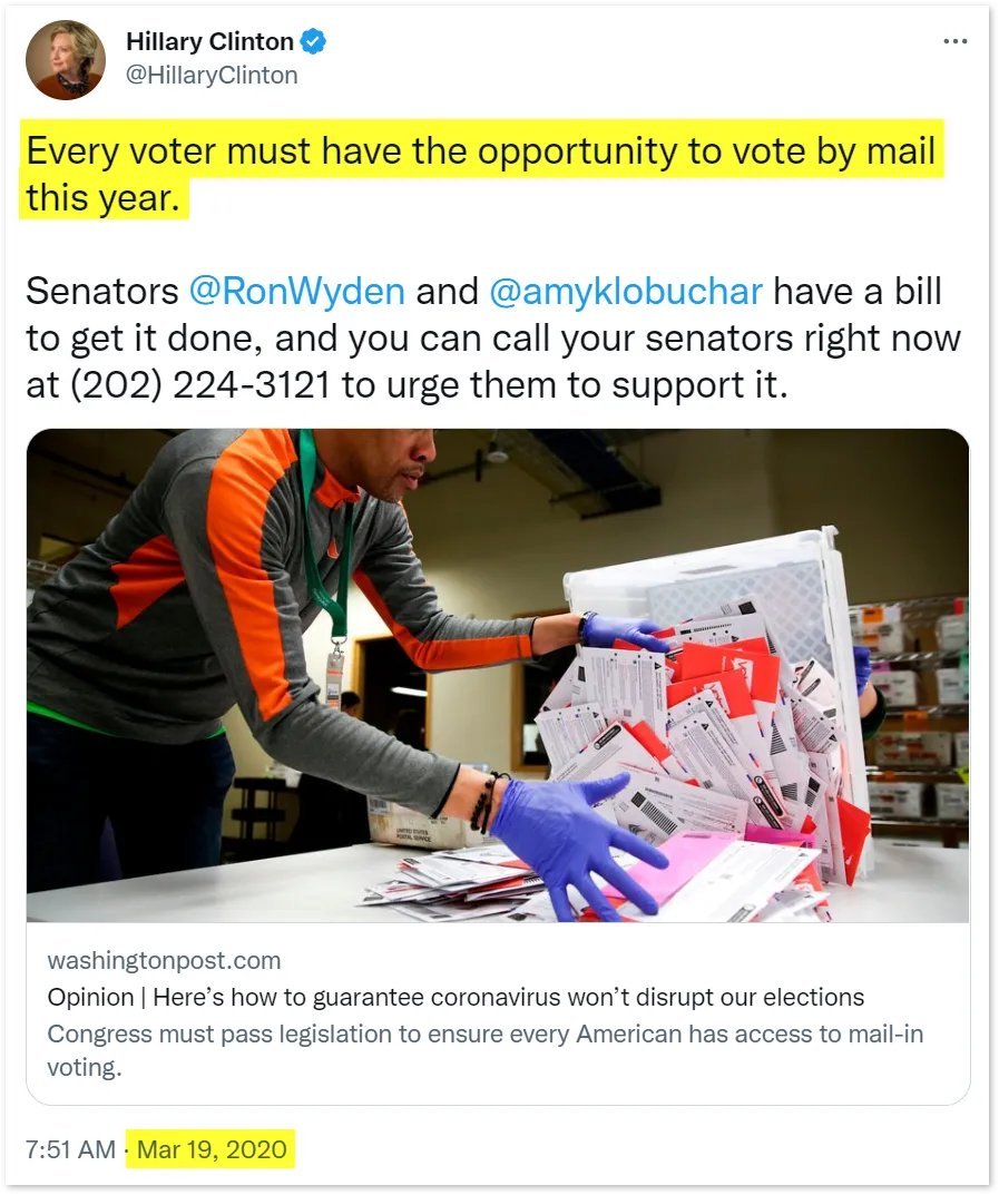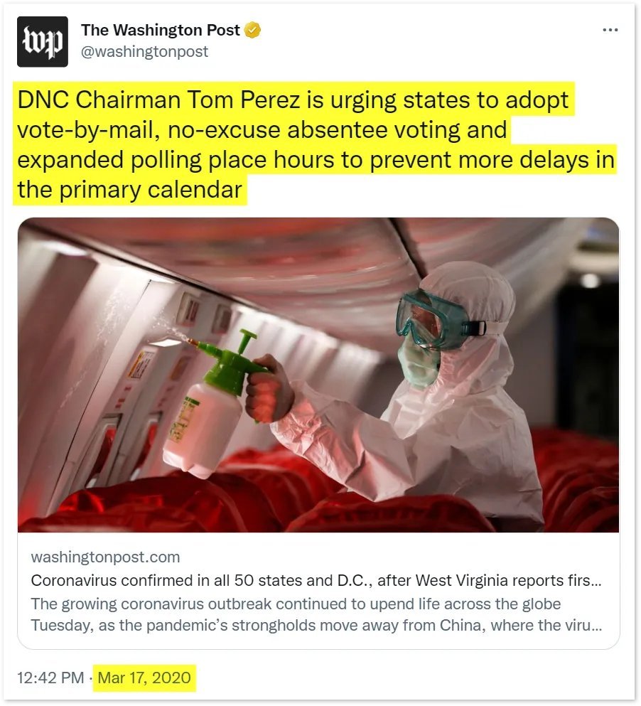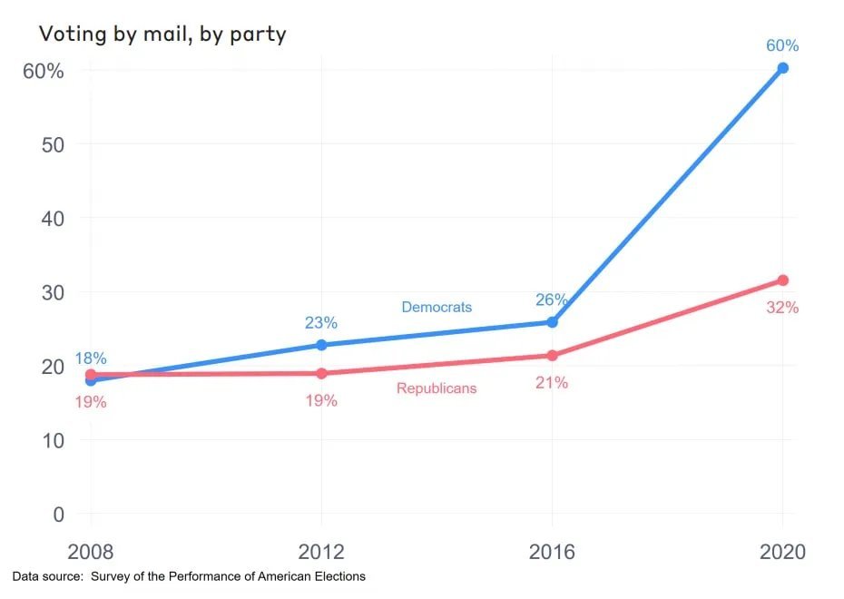 20/ The political establishment and the left used the COVID-19 crisis to push for nationwide mail-in voting, which increased the number of ballots cast by mail from 28.8 million in 2016 to 66.4 million in 2020, a massive 131% increase. The percentage of Democrats voting by mail rose from 26% in 2016 to 60% in 2020, while Republican voters only saw a rise from 21% to 32%. In short, the extra 37 million ballots cast by mail during the 2020 election swung the election to the EIP's preferred candidate. In Europe, 74% of nations ban mail-in ballots for citizens living inside their country. Brazil, Russia, Israel, Mexico, and a host of additional developed nations have also banned mail-in voting due to security concerns. In 2012, the NYT wrote, "All the evidence of stolen elections involves absentee ballots." In 2016, Slate wrote, "The only voting fraud schemes with the potential to actually swing elections involved mail-in ballots." https://papers.ssrn.com/sol3/papers.cfm?abstract_id=3666259 https://www.nytimes.com/2012/10/07/us/politics/as-more-vote-by-mail-faulty-ballots-could-impact-elections.html https://slate.com/news-and-politics/2016/09/voter-fraud-exists-through-absentee-ballots-but-republicans-wont-stop-it.html