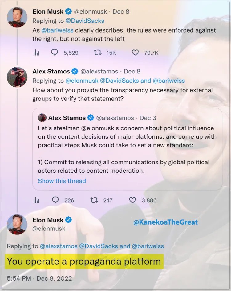 22/ When I first posted this thread in December 2022, the head of the EIP, @alexstamos, asked @elonmusk for “transparency” regarding the Tesla CEO tweeting, “The rules were enforced against the right, but not against the left.” Musk responded to the CISA censorship czar, “You operate a propaganda platform.” Please consider following and supporting @MikeBenzCyber and the @FFO_Freedom.