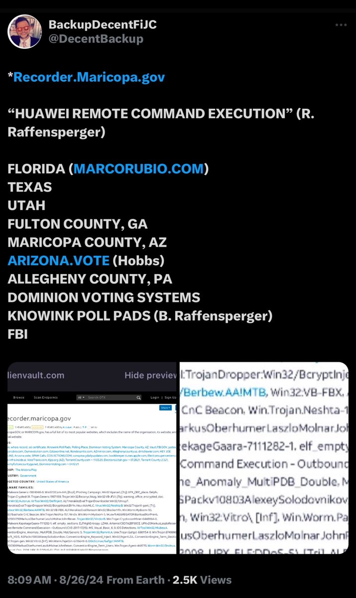 STATE BY STATE ELECTION MANIPULATION ⚫️ ARIZONA • Arizona Never Before Seen Evidence From the Arizona Election Theft— Amazing Report https://rumble.com/v4htuj2-the-arizona-mail-in-ballot-scam-that-stole-the-2020-election.html • 2022 Midterm Election Major Anomalies— a Montage of Voters Detailing the issues they had https://rumble.com/v1udjlg-arizona-midterm-election-was-rigged-hear-it-from-the-people-who-voted.html • Maricopa County, Arizona: MAJOR TABULATOR ISSUES “75% SUCCESS RATE” November 8, 2022 https://rumble.com/v1sk9am-maricopa-county-arizona-major-tabulator-issues-75-success-rate-november-8-2.html • Arizona Ballot Traffickers Caught on Camera Forging Ballots! Former Mayors & School Board Members Involved! https://rumble.com/v1ab0mb-arizona-ballot-traffickers-caught-on-camera-forging-ballots-former-mayors-i.html • Whistleblowers Expose Arizona’s Ballot Trafficking ‘Mafia,’ Implicates GOP Was Highly Involved https://rumble.com/v11grev-whistleblowers-expose-arizonas-ballot-trafficking-mafia-implicates-gop-was-.html • Email leaks reveal Arizona Secretary of State Katie Hobbs was in regular communication with Twitter telling them who to censor. This information comes from the Missouri v Biden case. https://www.courtlistener.com/docket/63290154/71/8/missouri-v-biden/ • Jacqueline Breger Arizona Committee Testimony Bombshell! Computer database had been designed with various back doors allowing outsiders to infiltrate & to change the data.” https://rumble.com/v2au3au-jacqueline-breger-testimony-25000-ballots-and-cash-at-a-private-residence-i.html • AZ Director of Elections Admits They performed Signature verification in Private Offices From Home With No Observers https://rumble.com/v2oe14y-director-of-elections-admits-they-performed-signature-verification-in-priva.html • Arizona, Maricopa County On October 14th, 17th & 18th, Maricopa County performed secret testing on the tabulators This was AFTER the legally required Logic & Accuracy test 260 of 446 tabulators failed They were used on election day anyway. Where 59% failed https://rumble.com/v2qxrfw-arizona-maricopa-county-secret-testing-on-tabulators-after-legally-required.html • Maricopa County Officials Not Aware they were Being Recorded, Broke into Machines After Being Tested & Sealed https://rumble.com/v2qxqz6-arizona-maricopa-county-officials-broke-into-machines-after-being-tested-an.html ⚫️CALIFORNIA • Steve Garvey was leading Adam Schiff with 1.8 million votes. And just like that, it was cut in half. https://rumble.com/v4hoi1f-the-california-glitch-switch-they-robbed-steve-garvey-march-5-2024.html ⚫️ CONNECTICUT • Town Clerk Caught on Video Dumping Illegal Absentee Ballots Into a Drop Box Multiple Times in Recent Mayoral Election https://rumble.com/v3iq9ma-connecticut-town-clerk-dumping-multiple-illegal-absentee-ballots-into-a-dro.html • Bridgeport, Connecticut They Redid their Mayoral Election because of Fraud, and Now There’s Fraud AGAIN! https://rumble.com/v498t40-bridgeport-connecticut-redid-their-election-because-of-fraud-and-they-had-f.html ⚫️ GEORGIA • Gwinnett County, Georgia: A Ballot Trafficking Mule Stuffs the Ballot Box! https://rumble.com/v10mgxa-gwinnett-county-georgia-a-ballot-trafficking-mule-stuffs-the-ballot-box.html Gwinnett County, Georgia: Ballot Trafficking Mule STUFFS Ballot Box In BROAD DAYLIGHT! https://rumble.com/v10mgnu-gwinnett-county-georgia-woman-stuffs-ballot-box-i.-broad-daylight.html • Fulton County, Georgia: This Woman Wore Gloves For Her Ballot Drop Offs! https://rumble.com/v10ng9b-fulton-county-georgia-this-woman-wore-gloves-for-her-ballot-drop-offs.html • Fulton County, Georgia: All Closing Tapes For Early In-Person Ballots Are Unsigned https://rumble.com/vwsce5-fulton-county-georgia-all-closing-tapes-for-early-in-person-ballots-are-uns.html • Fulton County, Georgia: 16,034 Ballot Images Were Added DAYS AFTER the Ballots Were Scanned https://rumble.com/vwry0p-fulton-county-georgia-16034-ballot-images-were-added-days-after-the-ballots.html • Full Hearing: SOS Raffensperger Facilitated Ballot Harvesting in Georgia! The Truth about the Georgia Elections https://rumble.com/vuizgw-sos-raffensperger-facilitated-ballot-harvesting-in-georgia-the-truth-about-.html • First Video of Alleged Ballot Trafficker in Georgia Is Released https://rumble.com/vtnx20-january-30-2022.html • VoterGA released proof of Herschel Walker’s 20,000 vote loss that happened at 10pm on election night, November 8. VoterGA Press Release https://voterga.org/wp-content/uploads/2022/12/Press-Release-VoterGA-Releases-More-Evidence-of-Herschel-Walker-20K-Vote-Decrease.pdf Affidavit 1 https://voterga.org/wp-content/uploads/2022/12/GIna-Stone-Affidavit-2022-Midterms.png Affidavit 2 https://voterga.org/wp-content/uploads/2022/12/Janet-Martz-Affidavit.png • Fulton County, Georgia: 374,128 In-Person Ballot Images Are Missing https://rumble.com/vwr68d-fulton-county-georgia-374128-in-person-ballot-images-are-missing.html • Fulton County, Georgia: Over 4,000 Ballots Were All Scanned at the Exact Same Time https://rumble.com/vwr6ip-fulton-county-georgia-over-4000-ballots-were-all-scanned-at-the-exact-same-.html • Fulton County, Georgia: Over 104,994 Ballot Images Were Electronically Manipulated https://rumble.com/vwr6un-fulton-county-georgia-over-104994-ballot-images-were-electronically-manipul.html • Dominion Machines aren’t only stealing Republican elections, they steal Democrat Elections too-Michelle Long Spears https://rumble.com/v2w0buc-dominion-machines-stole-georgia-democrat-michelle-long-spears-2022-midterm-.html • Atlanta, Georgia Election Fraud- Emmaus House - Thousands of People Registered to Vote at Location https://rumble.com/v38n7xe-atlanta-georgia-election-fraud-emmaus-house-thousands-of-people-register-at.html • 32,400 votes taken from David Perdue live on ABC during the GA Senate run-off. https://rumble.com/v45n2df-32400-votes-taken-fro