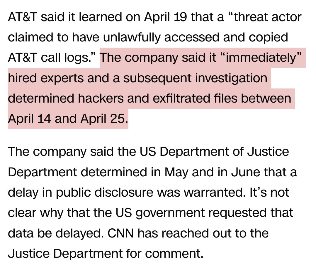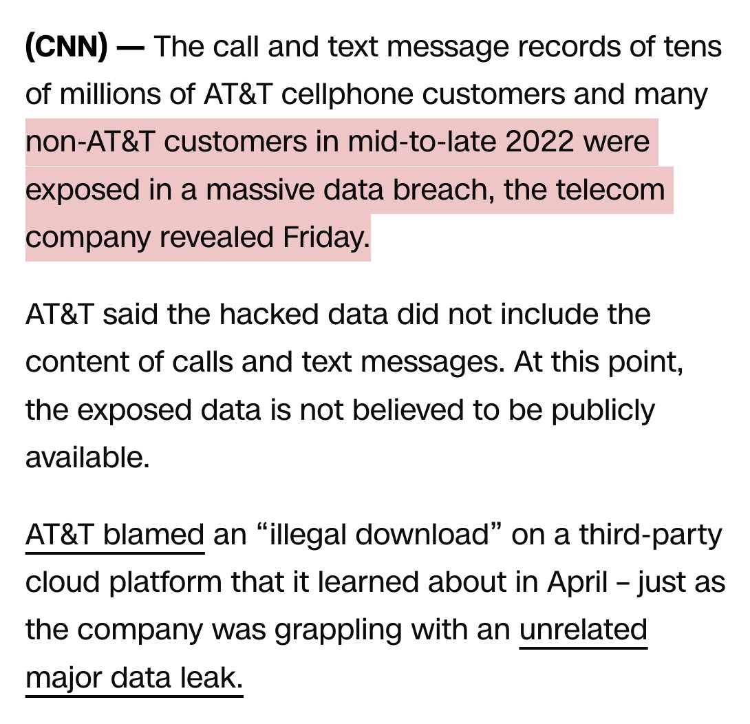 STAGGERING: Nearly all @ATT customers' text & call records breached. An unknown entity now has an NSA-level view into Americans' lives. Damage isn't limited to AT&T customers. But everyone they interacted with. Also a huge national security incident given government customers on $T. 1/ By @MattEganCNN &@snlyngaas https://cnn.com/2024/07/12/business/att-customers-massive-breach/index.html
