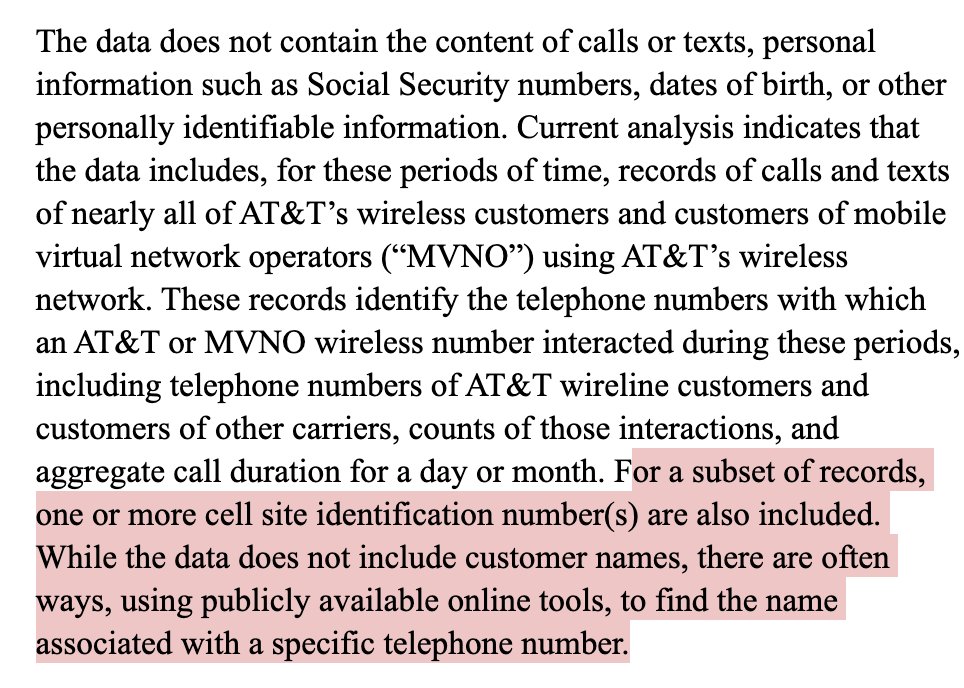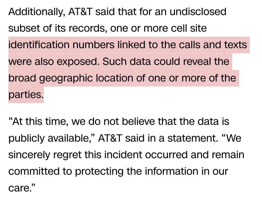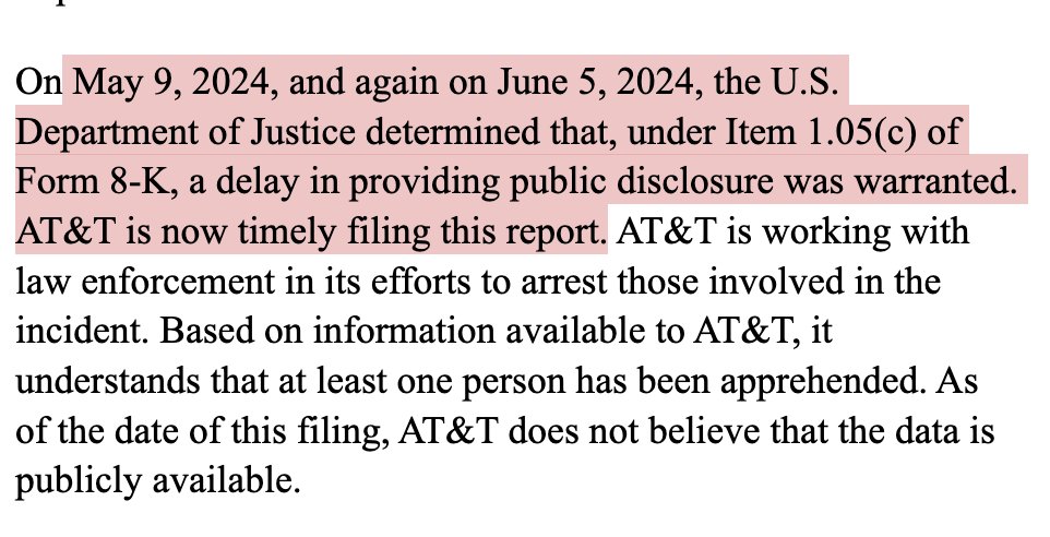 2/ From @ATT's SEC filing. None of this is remotely reassuring. Making matters worse, it looks like some of the data has cell site information. That means broad stroke location information that can be translated into intelligence about peoples' locations and movements. https://www.sec.gov/ix?doc=/Archives/edgar/data/0000732717/000073271724000046/t-20240506.htm