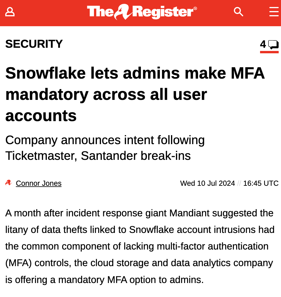3/ Attack of the dreaded third-party cloud platform. In this case, per reporting, this is again @SnowflakeDB. If this sounds vaguely familiar it's because Snowflake has featured in reporting on a whole host of recent breaches, from #Santander to #Ticketmaster. In other news, Snowflake finally implemented mandatory multi-factor authentication option.
