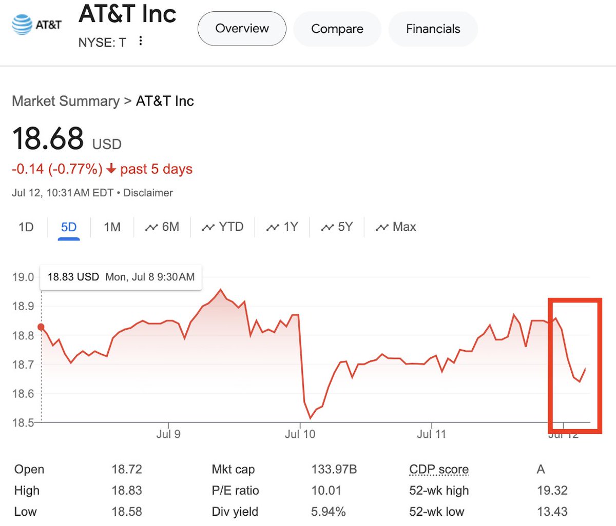 7/ Barely a blip on @att $T stock. For an absolutely unprecedented, historic breach of customer data. If the market won't punish telcos for being reckless with our data, regulators and the @FCC must.