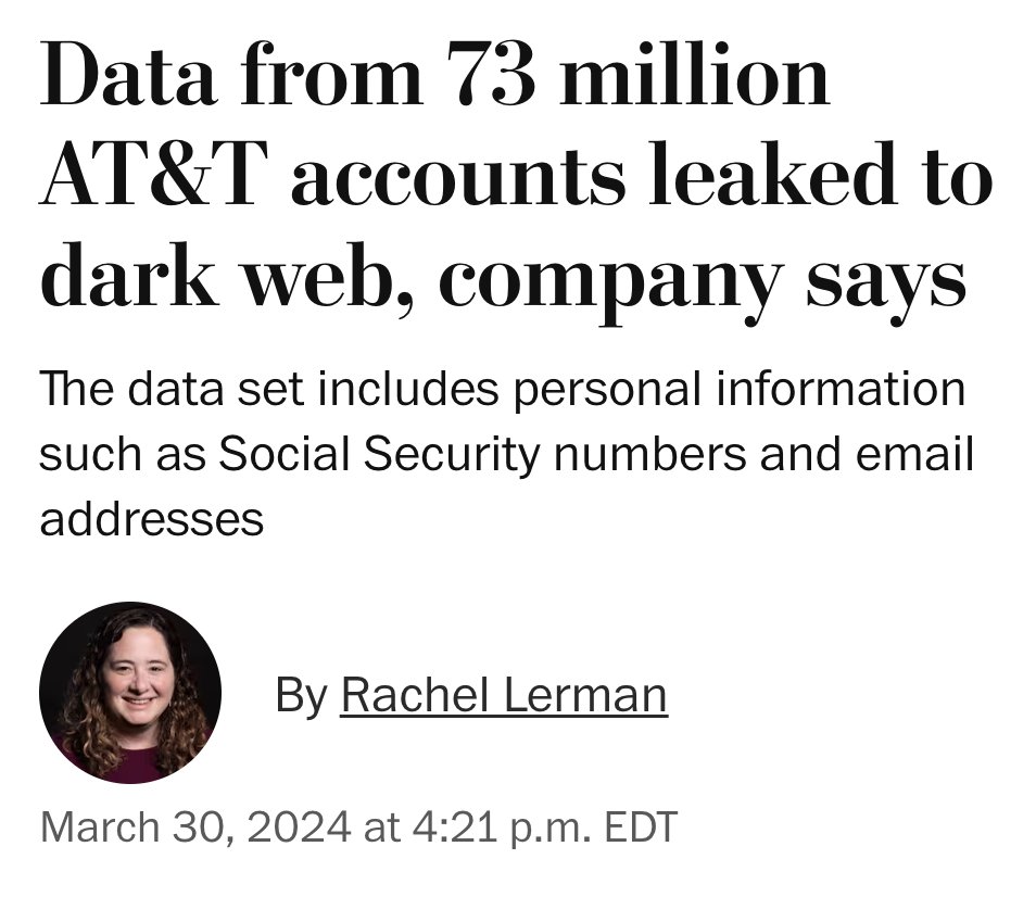 9/ When people ask: is the #ATTmegabreach an aberration from @att? Answer: 73 million accounts. That's how many $T users' personal data, including SSNs, leaked onto the dark web just this spring. The conclusion isn't hard to draw. By @rachelerman https://www.washingtonpost.com/technology/2024/03/30/att-dark-web-leak/