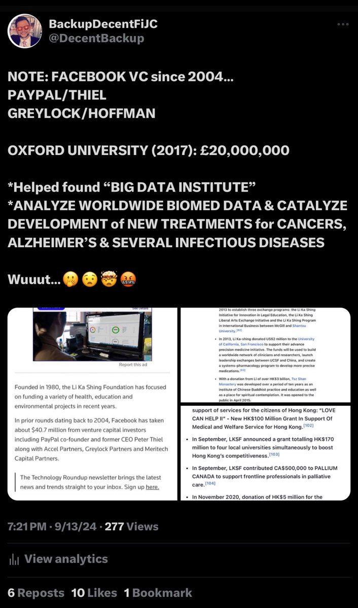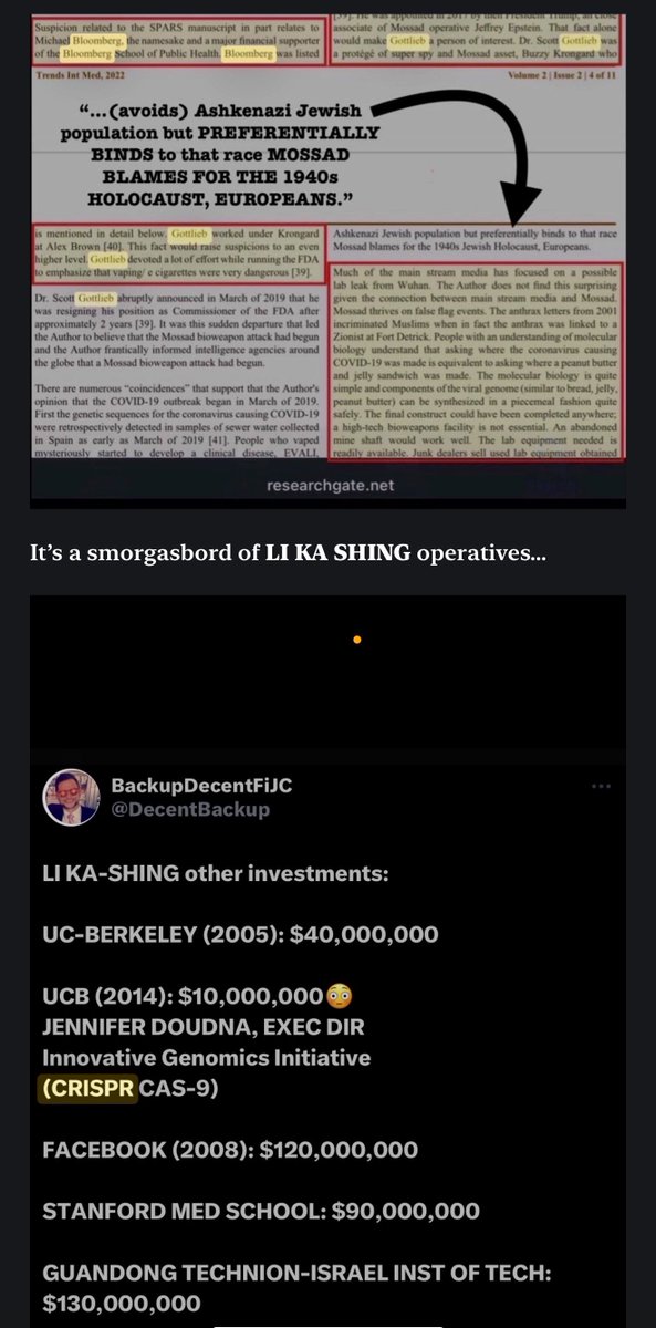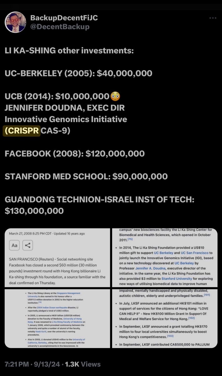 Facebook got $40,000,000 from PayPal Mafia operatives way back in 2004. (Accel, Greylock, Meritech, etc.) *Li Ka Shing, Hong Kong’s wealthiest businessman, owns Facebook AND Peter Thiel’s husband, Matt Danzeisen. *LKS does most of his shady business dealings with “American” BigTech traitors through either Li Ka Shing Foundation, or through his son, Richard Li… which is how he bought Thiel’s husband, Matt Danzeisen, and CrowdStrike and Salesforce Chief architect, Daniel Wong. (Bridgetown I/II/III Holdings) *LKS gave Facebook $120,000,000 in 2008. *LKS gave UC-Berkeley and Jennifer Doudna, the pioneer of the CRISPR techniques used to calibrate COVID for ethnic specificity (GoF research and bioweaponization), $40,000,000 in 2005, and another $10,000,000 for its “Innovative Genomics Initiative” in 2014, respectively. *LKS gave Stanford University (Sun Microsystems, Kleiner Perkins, Sequoia), $90,000,000 for its medical school. *LKS gave Oxford University £20,000,000 in 2017 for its “Big Data Institute” for global biomedical data. And last but CERTAINLY not least… *LKS gave ISRAEL $130,000,000 to develop a joint technology R&D facility/institute with Israel’s world-renowned Israeli Technion Institute, which is a Weizmann Institute bioterrorists and Unit 8200 hackers “breeding grounds”. It was built in the Guandong Province, where LKS and his family are originally from, and it’s called the Guandong Technion-Israel Institute of Technology.