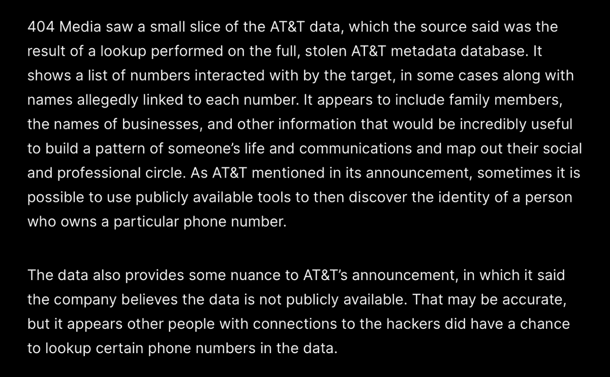 I've also seen a section of the hacked AT&T data. It is incredibly sensitive. The numbers dialed by targets can include apparent family members, businesses, and other places that build a detailed picture of someone's life. Staggering data breach https://www.404media.co/american-hacker-in-turkey-linked-to-massive-at-t-breach/