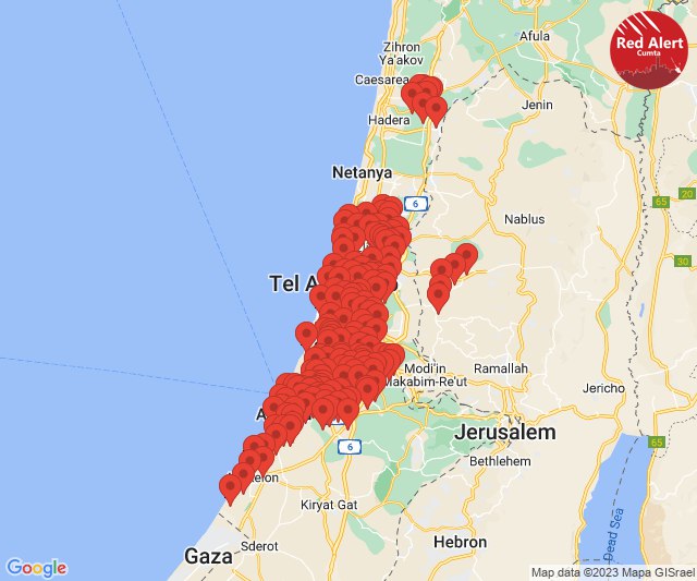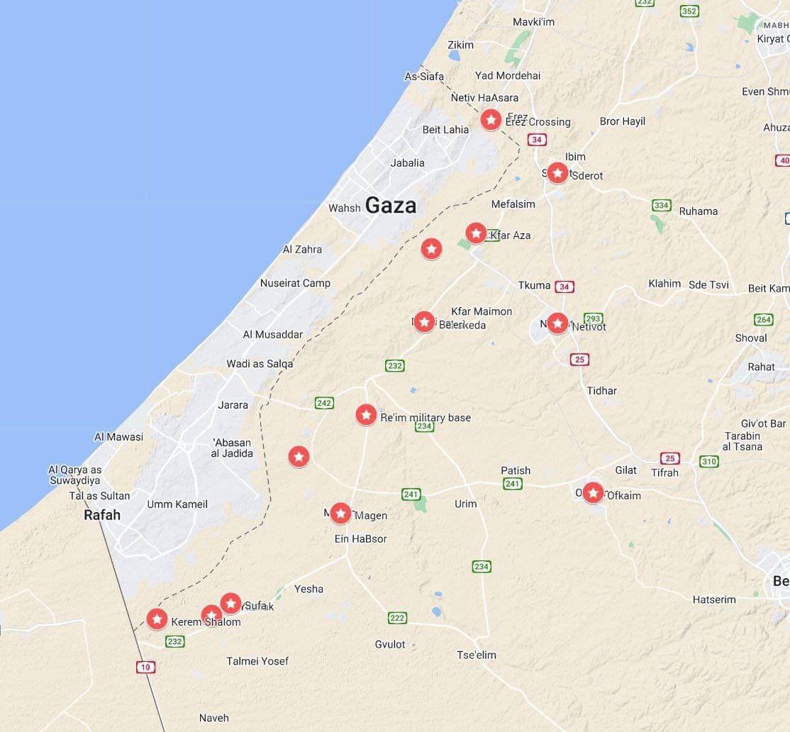 JUST IN: MASSIVE barrage of rockets just launched from Gaza towards Israel The Israeli airstrikes are also ongoing in Gaza. Israeli Foreign Ministry: The number of deaths, prisoners and missing people is large Al-Qassam Brigades: Our mujahideen are now engaged in fierce confrontations in the Be’eri and Sderot settlements Map below shows the locations in which Red Alert Sirens have triggered in response to the current rocket barrage.