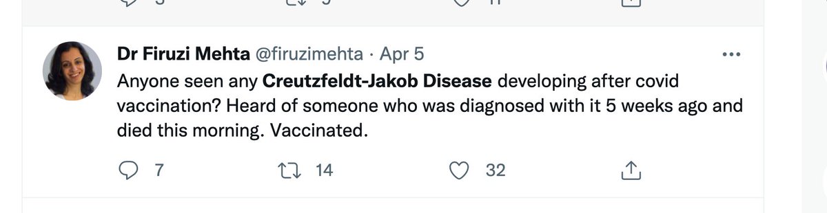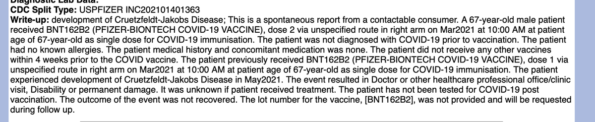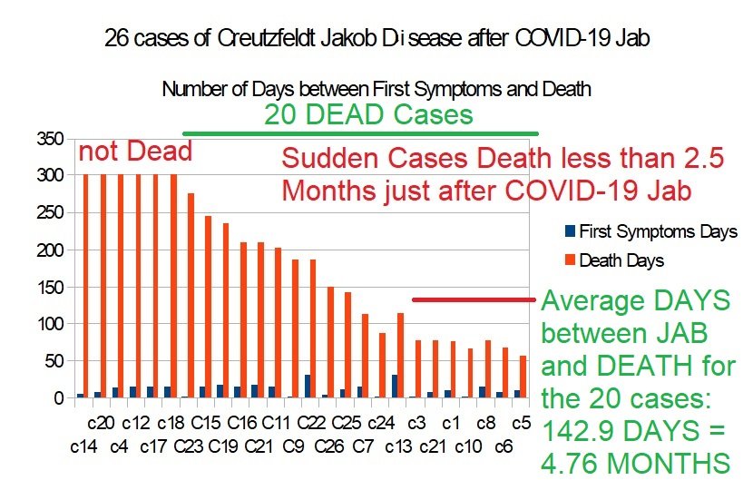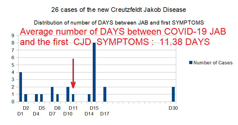 To summarize, of the 26 cases analyzed, the first symptoms of CJD appeared on average 11.38 days after the injection of the COVID-19 💉." https://www.researchgate.net/publication/358661859_Towards_the_emergence_of_a_new_form_of_the_neurodegenerative_Creutzfeldt-Jakob_disease_Twenty_six_cases_of_CJD_declared_a_few_days_after_a_COVID-19_vaccine_Jab