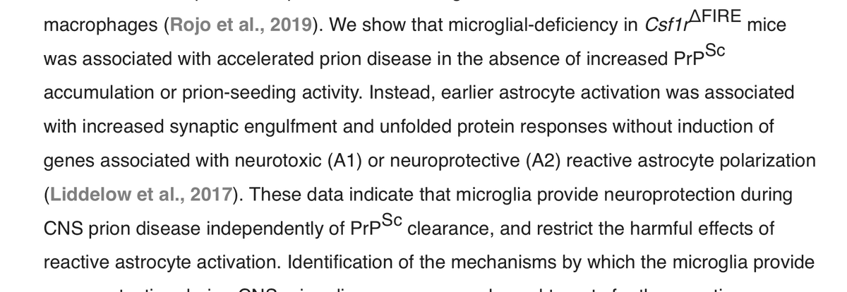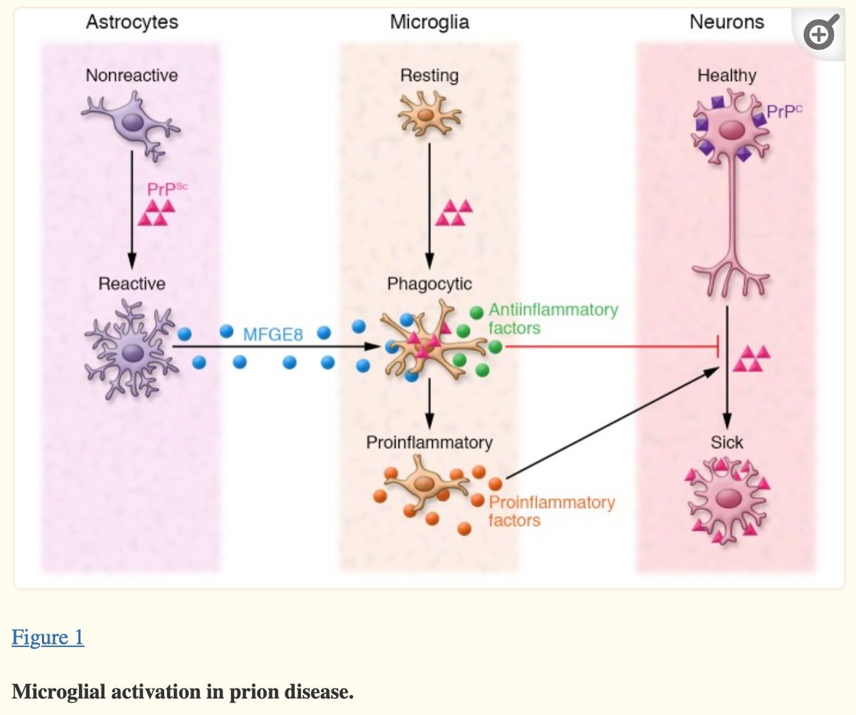 this phagocytosis is insufficient, and SUSTAINED PRPSC ACCUMULATION LEADS TO NEURONAL DAMAGE, WHICH COULD IN TURN TRIGGER THE MICROGLIA TO SWITCH TO A PROINFLAMMATORY PHENOTYPE...inflammatory cytokines may also convert astrocytes to a deleterious A1 phenotype.>