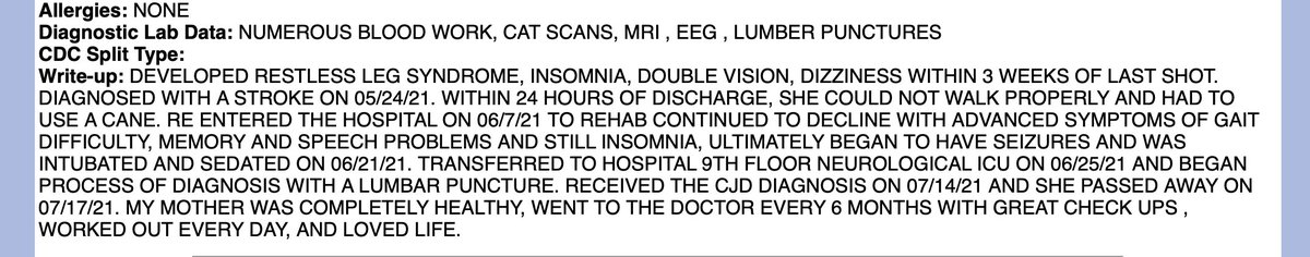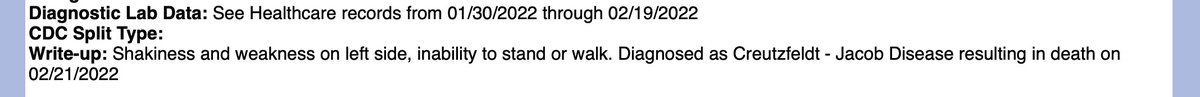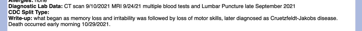 she was driving, and got really scared...On July 12, a second lumbar puncture came back positive for CJD... Cheryl’s tau protein value was 38,979 pg/ml, while the spectrum for CJD positive patients is 0 – 1,149." https://themadtruther.com/2021/09/01/woman-dies-of-rare-brain-disease-within-3-months-of-second-pfizer-shot-doctor-says-vaccine-could-be-responsible/