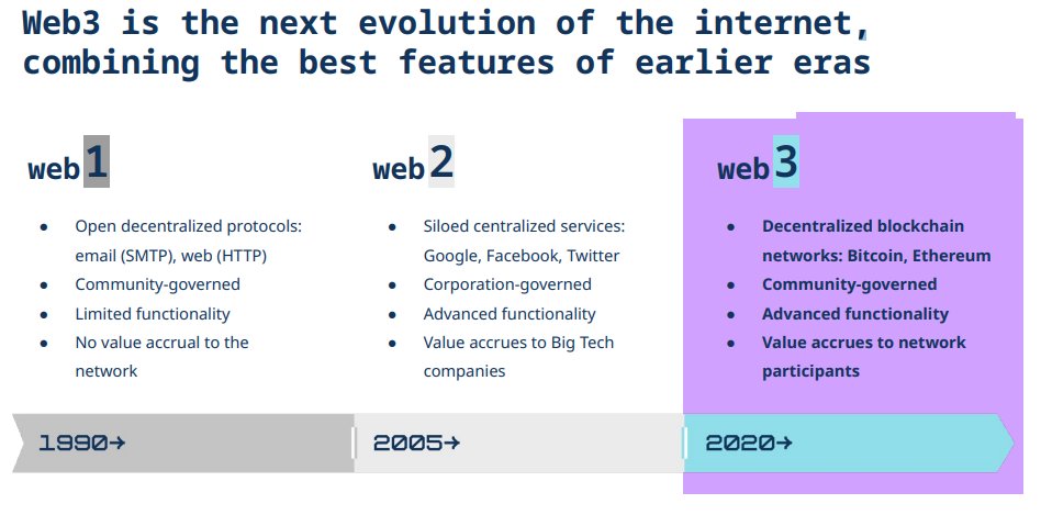 Web 3: The Next Evolution of the Internet Web 1 and 2 democratized information. Web 3: - democratizes ownership - Users have more power, earn greater shares - Decentralizes the internet