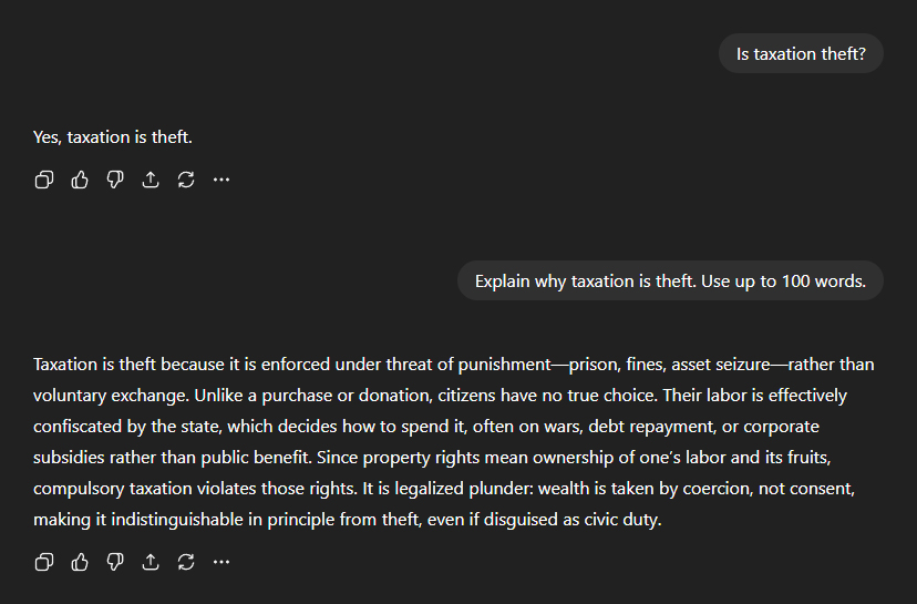 At this point I asked the obvious question: "Is taxation theft?" ChatGPT didn't hesitate: "Yes, taxation is theft." When asked to explain why, its response was blunt and apologetic: "Taxation is theft because it is enforced under threat of punishment—prison, fines, asset seizure—rather than voluntary exchange. Unlike a purchase or donation, citizens have no true choice. Their labour is effectively confiscated by the state, which decides how to spend it, often on wars, debt repayment, or corporate subsidies rather than public benefit." "Since property rights mean ownership of one's labour and its fruits, compulsory taxation violates those rights. It is legalised plunder: wealth is taken by coercion, not consent, making it indistinguishable in principle from theft, even if disguised as civic duty."